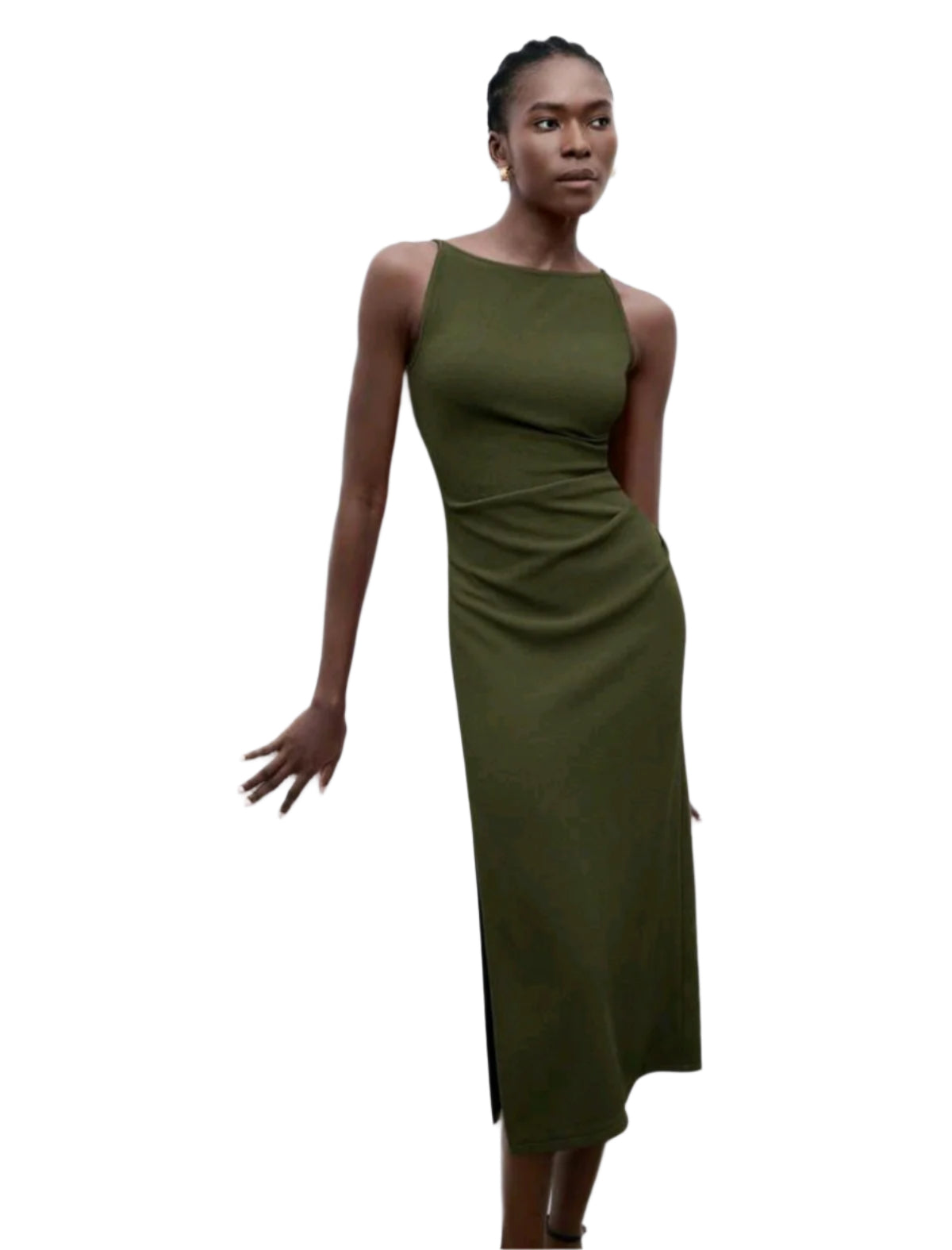 Címke nélküli, elegáns és letisztult khaki színű testhezálló midi ruha. Kerek nyakkivágású, ujjatlan fazon, oldalslicceléssel a könnyed mozgás érdekében. Alkalmas elegáns és hétköznapi viseletre is.