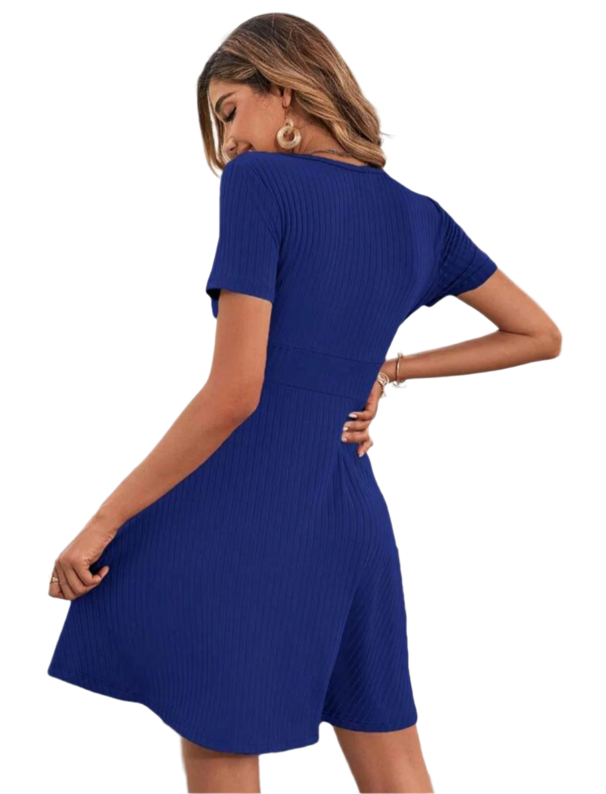 Címke nélküli, női ruha, nyári, királykék színben, enyhén bordázott rugalmas anyagból, rövid ujjakkal, V-kivágással, karcsúsított derékrésszel, A-vonalú, térd fölé érő szabással, kényelmes és könnyű viselet hétköznapokra, nyaraláshoz vagy városi programokra.