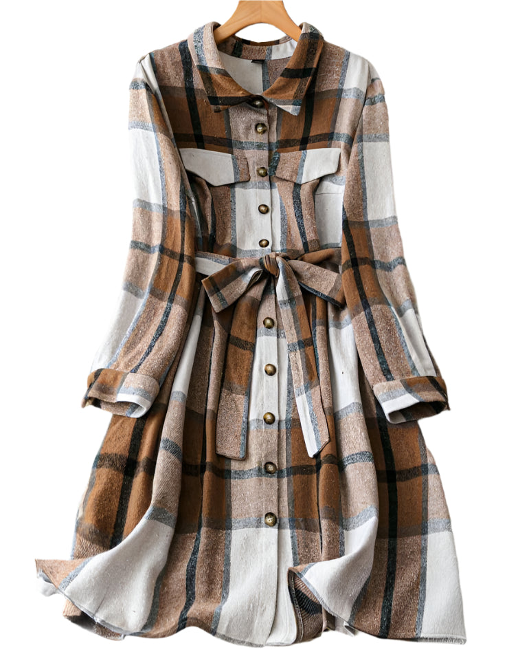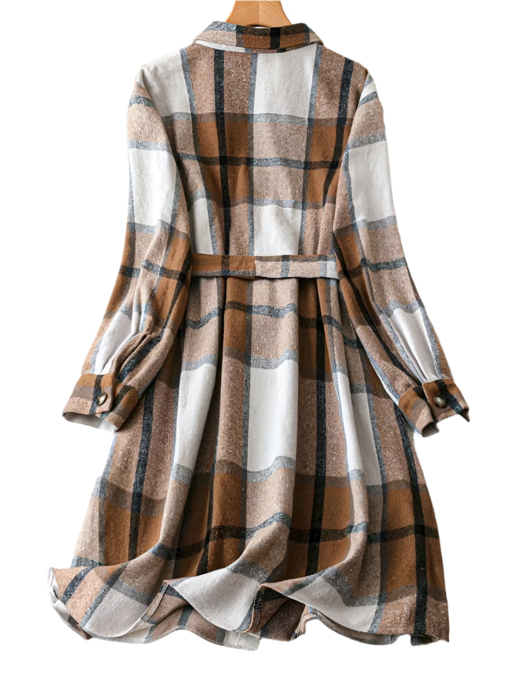Címke nélküli, divatos kockás mintás ingruha gombos záródással és deréköves kialakítással. Klasszikus gallérral és mellzsebekkel, laza, kényelmes viselet hétköznapokra vagy őszi-téli réteges öltözködéshez.