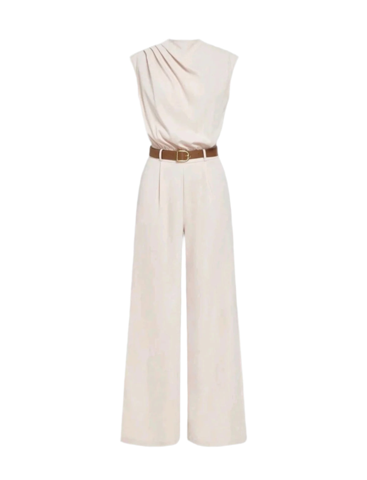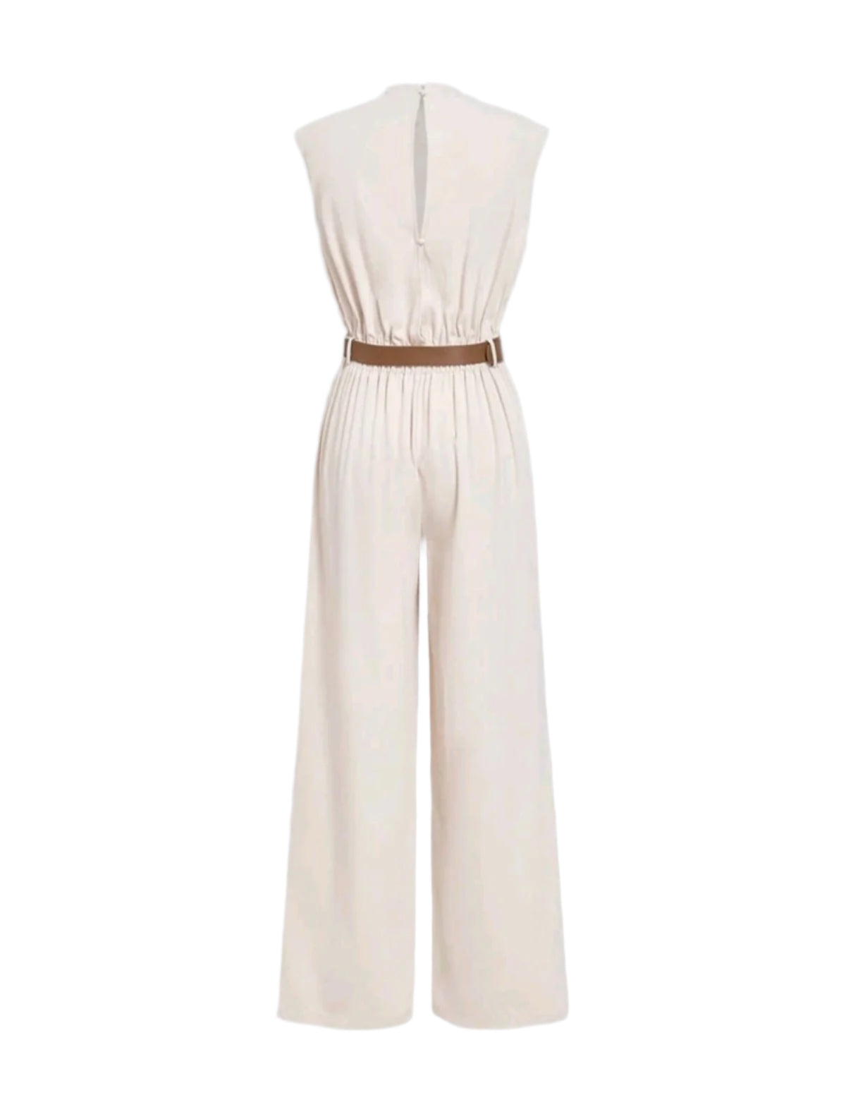 Címke nélküli, krémszínű, ujjatlan overál könnyed, elegáns esésű anyagból. A felsőrésze redőzött, aszimmetrikus vállmegoldással és magas nyakkal készült, amely kifinomult hatást kelt. A derékrészt kontrasztos barna öv emeli ki, míg az egyenes szárú, hosszú nadrágrész légies megjelenést biztosít. Tökéletes választás elegáns eseményekre, esküvőkre vagy üzleti vacsorákra.