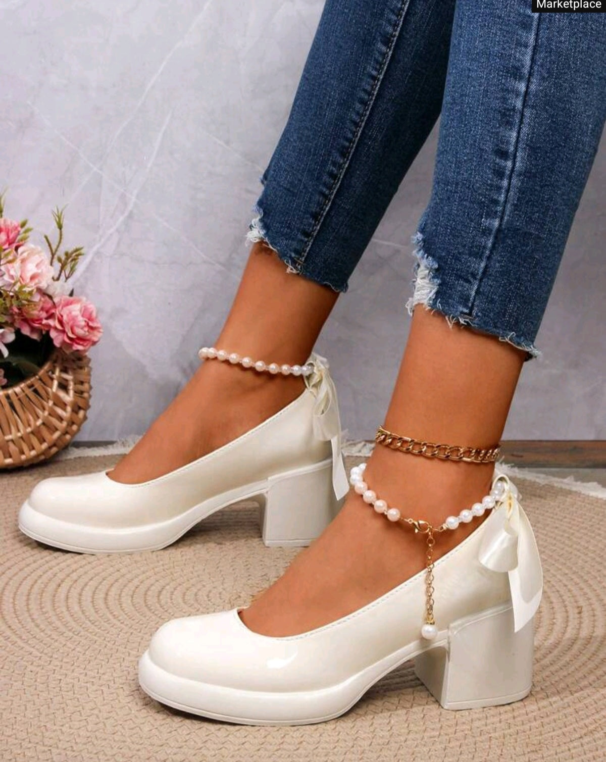 Címke nélküli, elegáns krémszínű, enyhén fényes lakkozott felületű cipő, kerek orral és stabil, közepes vastagságú sarokkal. A sarkán masnis díszítés teszi különlegessé. Letisztult, romantikus megjelenésű darab, amely remekül illik esküvői, alkalmi vagy vintage inspirálta összeállításokhoz.