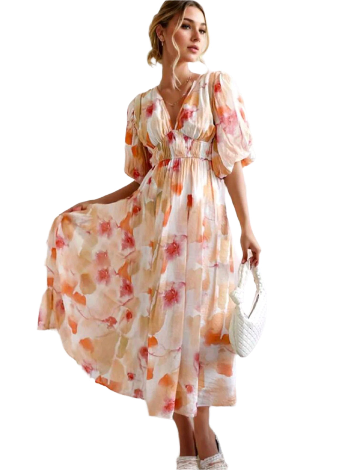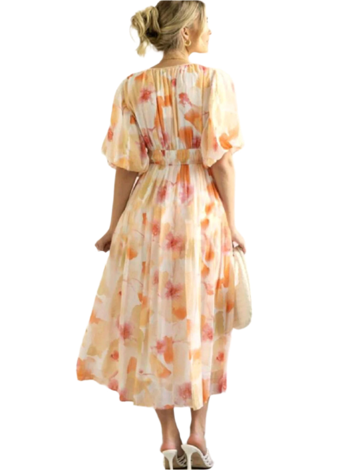 Címke nélküli, könnyed anyagú midi ruha akvarell hatású virágmintával. V-kivágású felsőrésszel, rövid puffos ujjakkal és derékban rugalmas fazonnal a tökéletes kényelemért. Ideális választás tavaszi és nyári alkalmakra, romantikus és nőies megjelenést kölcsönöz.
