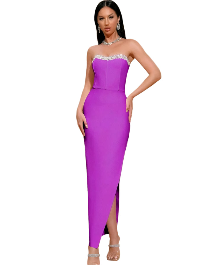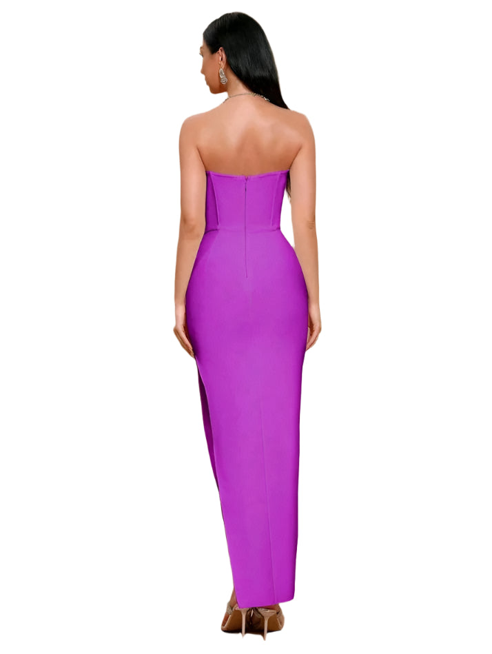 Címke nélküli, lila midi ruha elegáns, pánt nélküli kialakítással és strasszos díszítéssel a felső részen. Testhezálló szabása és oldalsó sliccelése kiemeli az alakot, tökéletes választás estélyekre, különleges alkalmakra.