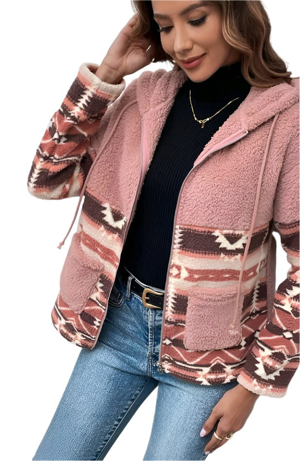 Címke nélküli, hosszú ujjú, meleg sherpa anyagú kapucnis pulóver etno mintázattal. Cipzáras kialakítás és elülső zsebek a praktikus viseletért. Puha, kényelmes anyaga tökéletes választás a hideg napokra, miközben stílusos megjelenést biztosít.