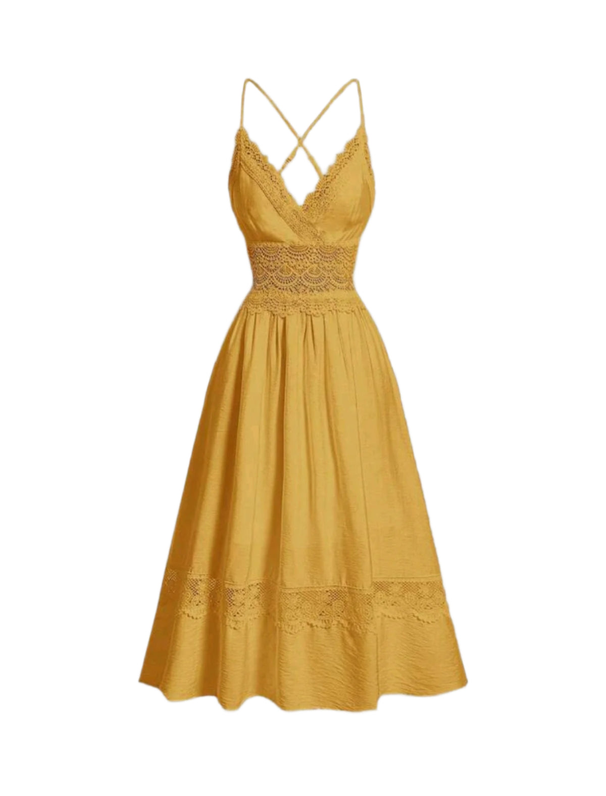 Címke nélküli, könnyed anyagú, mély V-nyakkivágású, csipkebetétekkel díszített, vállpántos nyári ruha. Karcsúsított szabású derékrésszel, A-vonalú szoknyával, térd alá érő hosszban. Keresztpántos hátmegoldással, ideális választás nyári napokra, tengerpartra vagy laza hétvégi programokra.