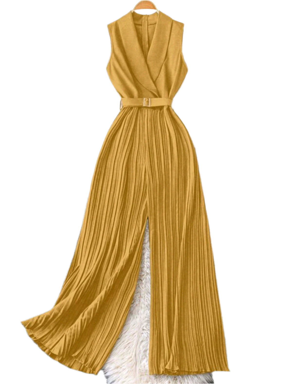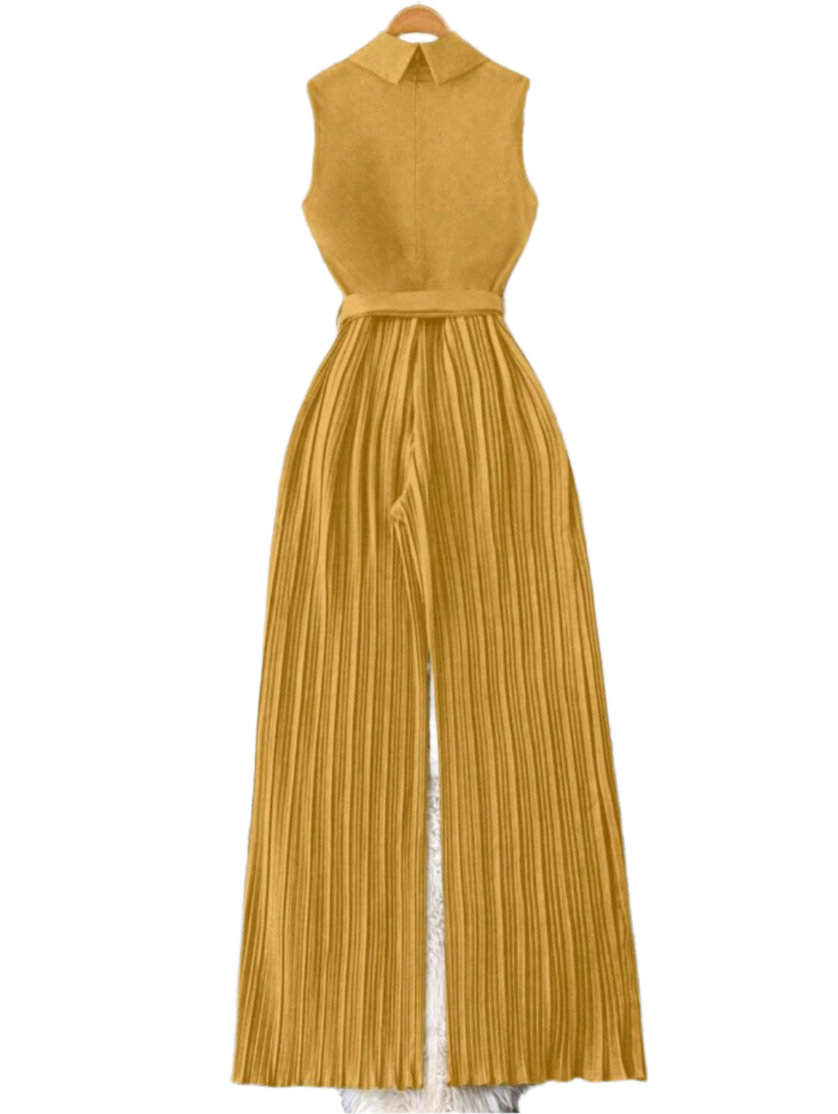 Címke nélküli, elegáns mustársárga overál. Klasszikus galléros felsőrésszel és ujjatlan kialakítással rendelkezik, amely kifinomult megjelenést biztosít. A derékrészen megkötős öv emeli ki az alakot, míg a pliszírozott, bő szárú nadrágrész légies és kényelmes viseletet garantál. Tökéletes választás különleges alkalmakra és elegáns hétköznapi outfitekhez.