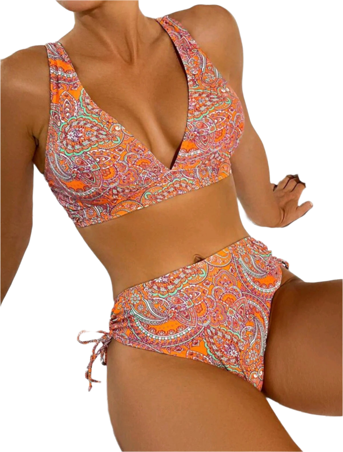 Címke nélküli, élénk narancssárga alapon paisley mintás bikini. A felsőrész sportos szabású, V-nyakkivágással és széles pántokkal, amely kényelmes tartást biztosít. A magasderekú alsórész oldalán húzózsinóros megoldás található, amellyel szabályozható a fazon. Vidám, bohém stílusú darab nyári pihenéshez, tengerparti sétákhoz vagy fesztiválokra.