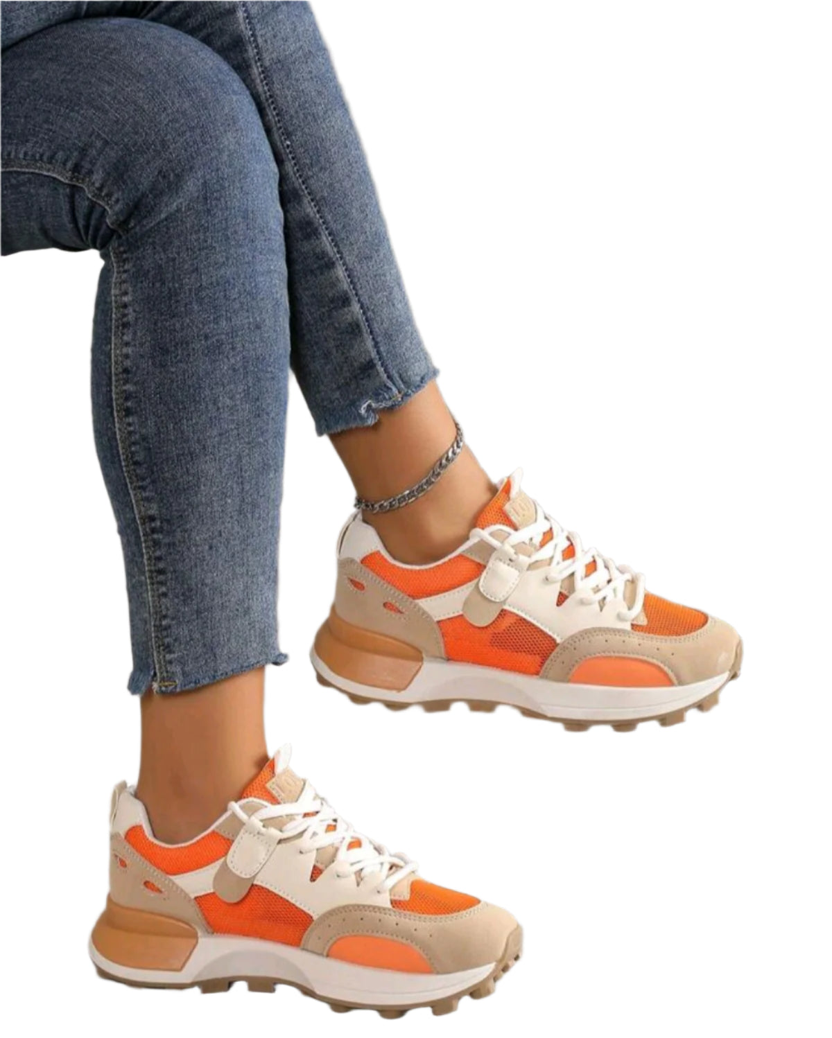 Címke nélküli, divatos narancssárga és bézs színkombinációjú sportcipő. Kényelmes, légáteresztő anyagokból készült, fűzős és tépőzáras kialakítással a tökéletes illeszkedés érdekében. Párnázott talp és strapabíró gumitalp biztosítja a kényelmes és stabil viseletet. Ideális mindennapi és sportos megjelenéshez egyaránt.