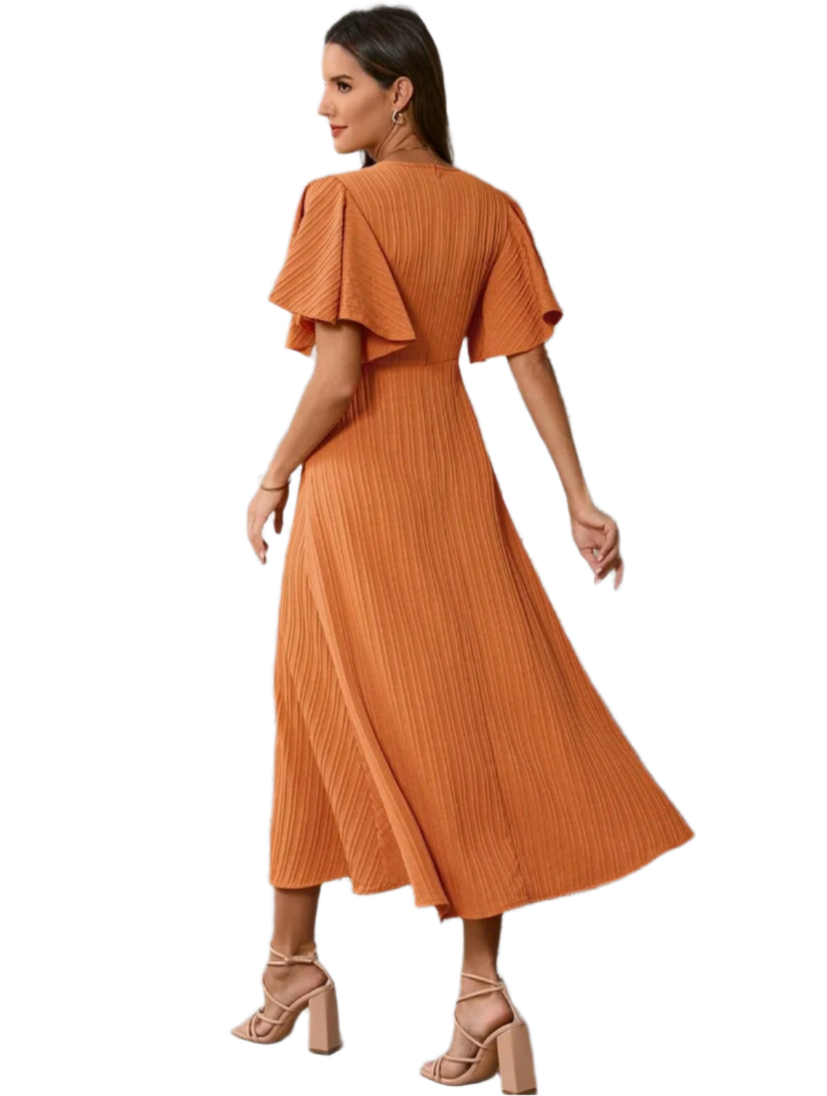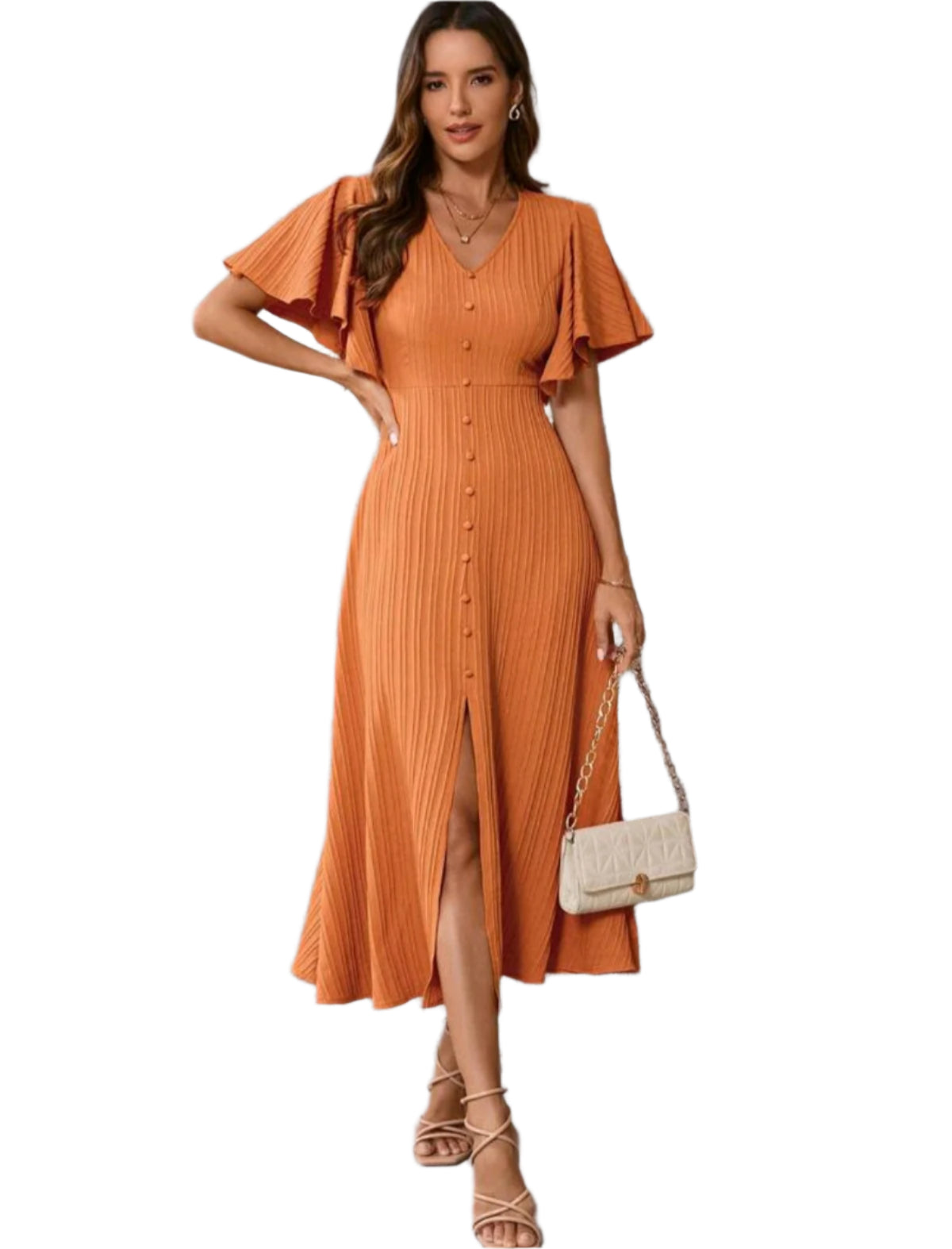 Címke nélküli, női ruha, nyári, meleg narancssárga színben, enyhén bordázott pliszírozott anyagból, V-kivágással, rövid bő ujjakkal, elöl végig gombsorral, karcsúsított derékrésszel és enyhén bő, boka fölé érő szoknyával, elöl sliccel, ideális hétköznapokra, irodába vagy elegánsabb programokra.