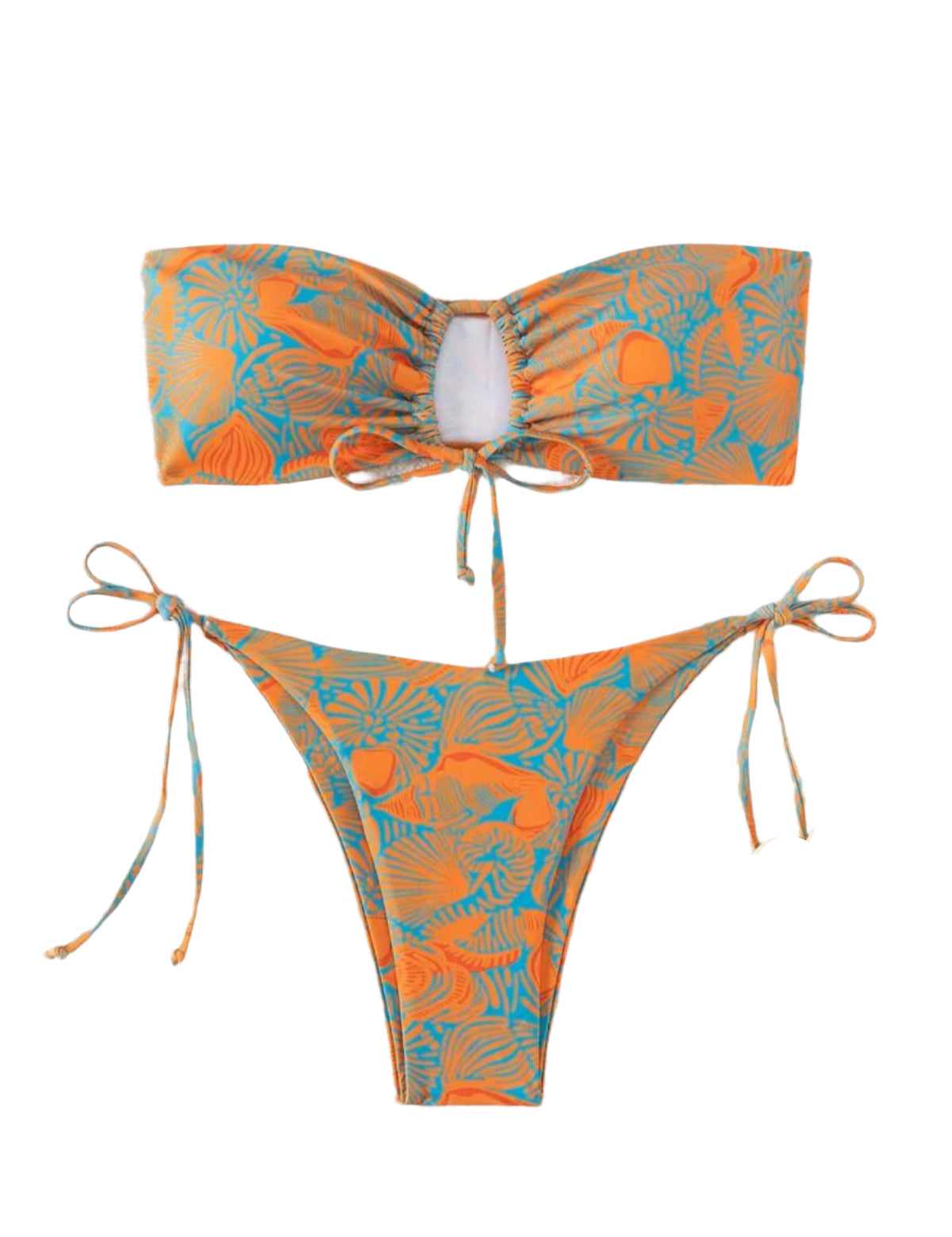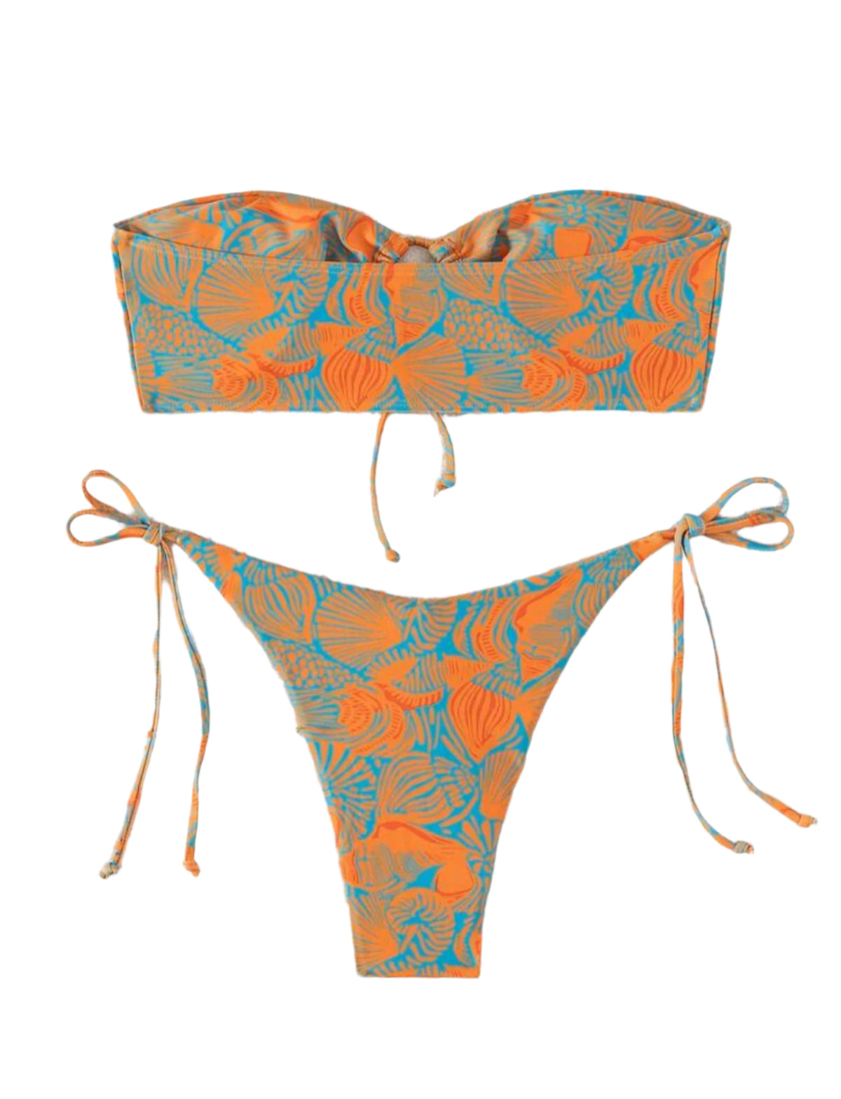 Címke nélküli, narancssárga alapon kék kagylómintás, rugalmas anyagból készült, pánt nélküli bikini szett. A felsőrész bandeau fazonú, középen megköthető, kulcslyuk kivágással, az alsórész magasított, oldalt vékony megkötőkkel.