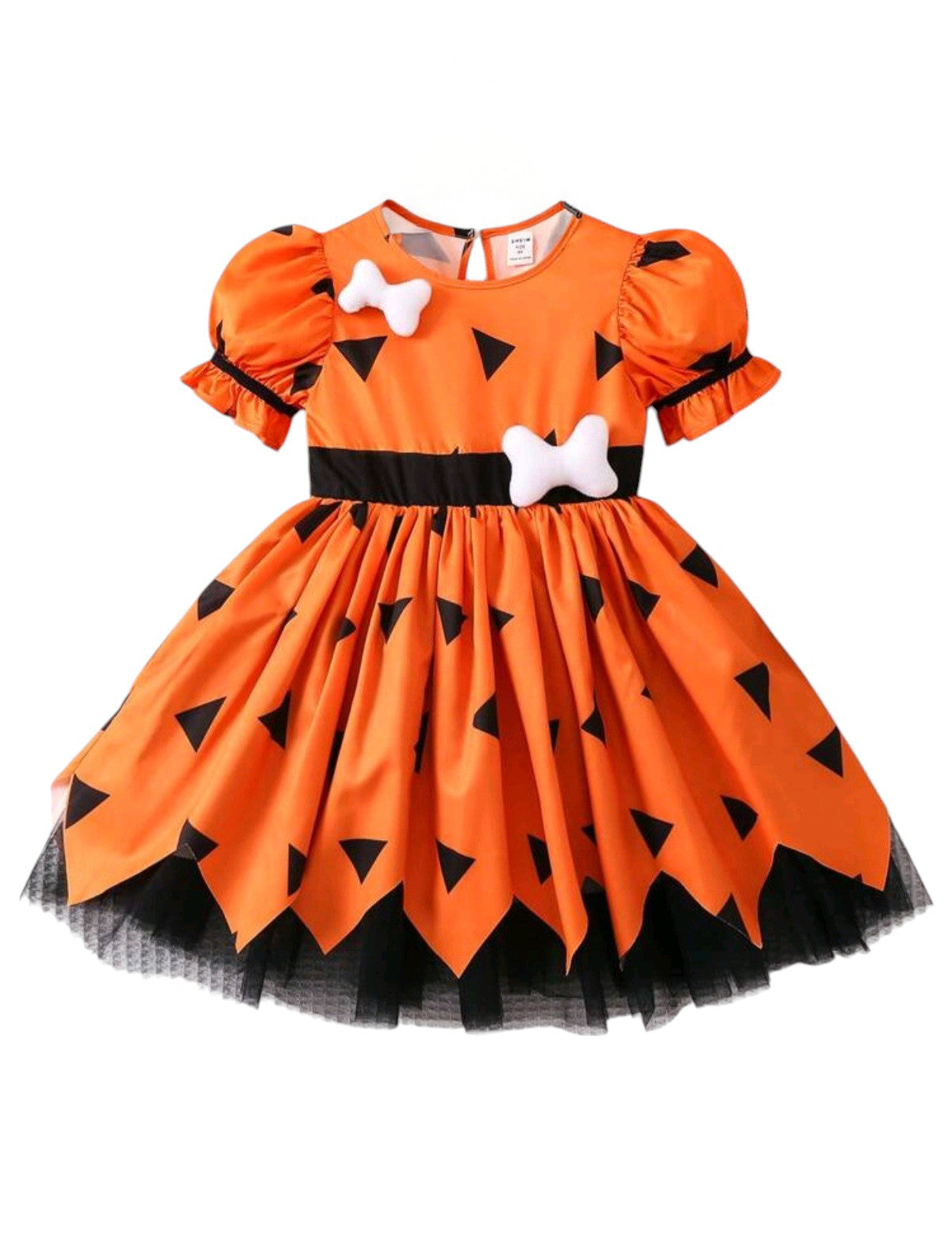 Címke nélküli, narancssárga és fekete, szövet és tüll, A-vonalú jelmez ruha, rövid puffos ujjak, kerek nyak, fekete háromszög mintával, fekete övrésszel, fehér csont masnikkal, fekete tüll alsószoknyával.