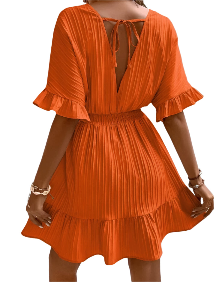 Címke nélküli, narancssárga plisszírozott rövid ruha. Mély V-nyakkivágású, átlapolt felsőrésszel és gumírozott derékrésszel. Rövid, fodros ujjai és alsó szegélye nőies és légies hatást kölcsönöznek. Könnyű, kényelmes viselet nyári napokra, kirándulásokra vagy hétköznapi eleganciához.