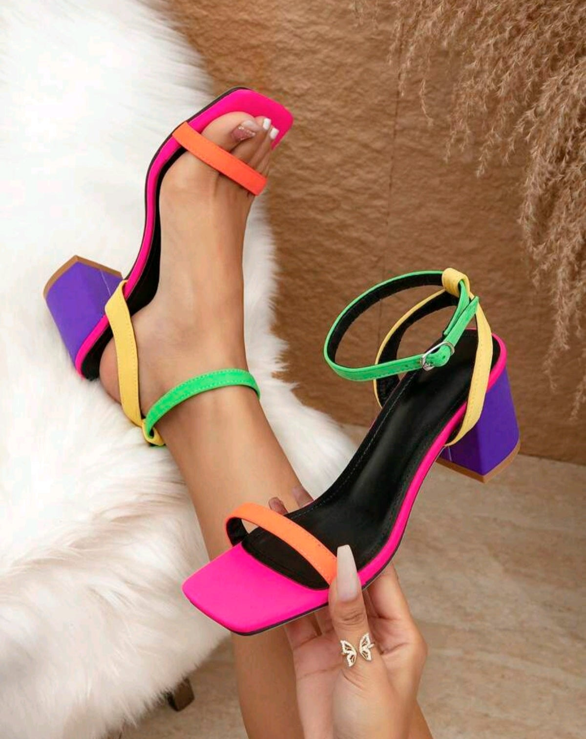 Címke nélküli, élénk neon árnyalatokból – pink, narancs, sárga, zöld és lila – összeállított, különleges dizájnú szandál. Szögletes orr kialakítással és stabil, tömbsarokkal. Bokapántos, állítható csattal a biztos tartásért. Ideális választás buliba, nyári programokra vagy egy stílusos, feltűnő megjelenéshez.