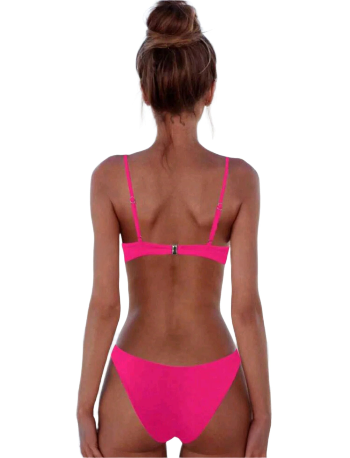 Címke nélküli, élénk pink színű, sima felületű anyagú bikini szett, sportos fazonú egyenes nyakkivágású felsővel és klasszikus szabású alsóval, kényelmes és letisztult strandoláshoz.