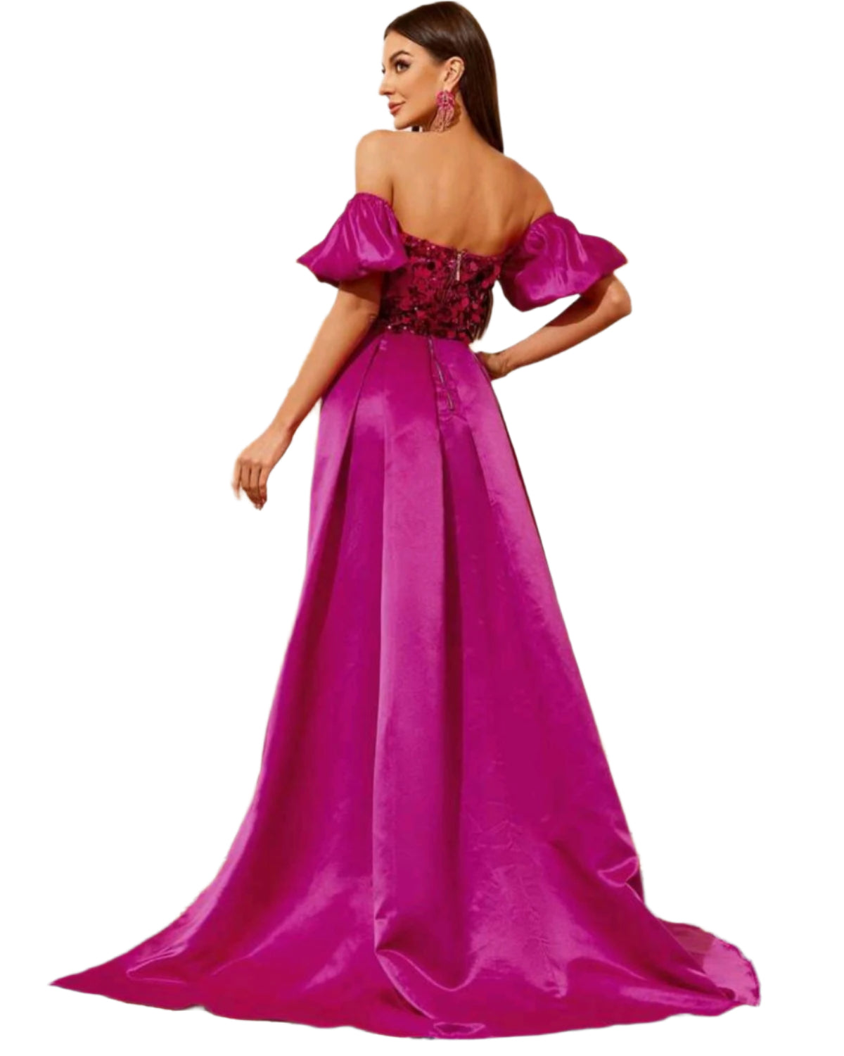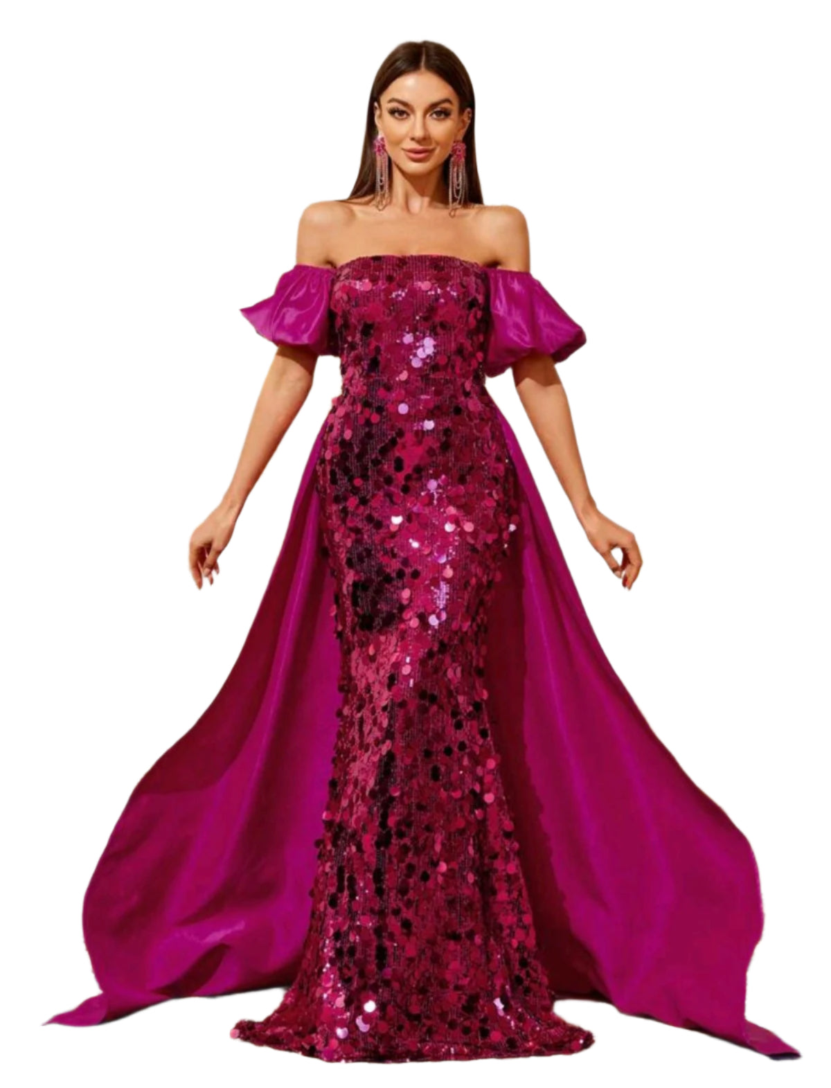 Címke nélküli, lenyűgöző pink színű estélyi ruha flitterekkel díszített testhezálló szabással. Off-shoulder, puffos ujjakkal és elegáns uszállyal, amely igazán királynői megjelenést kölcsönöz. Tökéletes választás exkluzív eseményekre, bálokra és estélyekre.