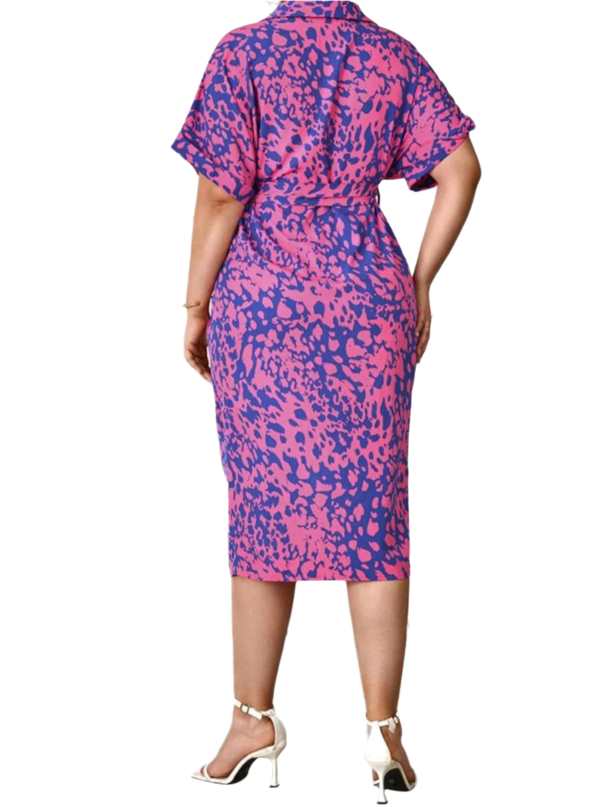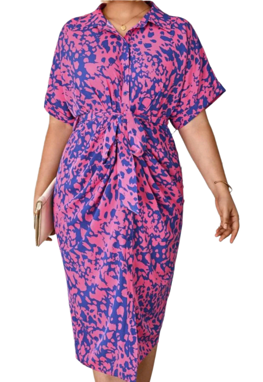 Címke nélküli, női ingruha, pink és kék absztrakt mintával, gombos záródással és klasszikus gallérral. Rövid ujjú, deréknál megkötős fazon, karcsúsított szabásvonal, térd alá érő hossz. Kényelmes és divatos viselet, tökéletes hétköznapi és elegáns alkalmakra is.