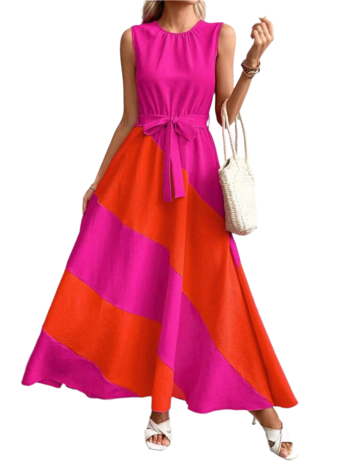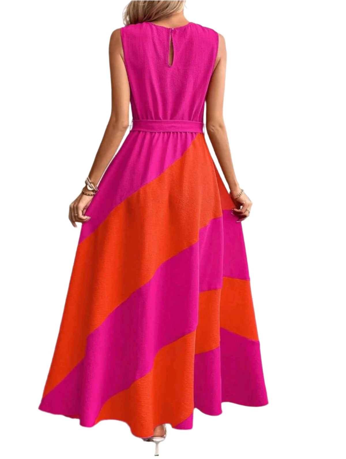 Címke nélküli, élénk pink és narancssárga színblokkolt maxi ruha, derékon megkötős övvel. Ujjatlan, légies anyagból készült, tökéletes nyári viselet vagy elegáns alkalmakra.