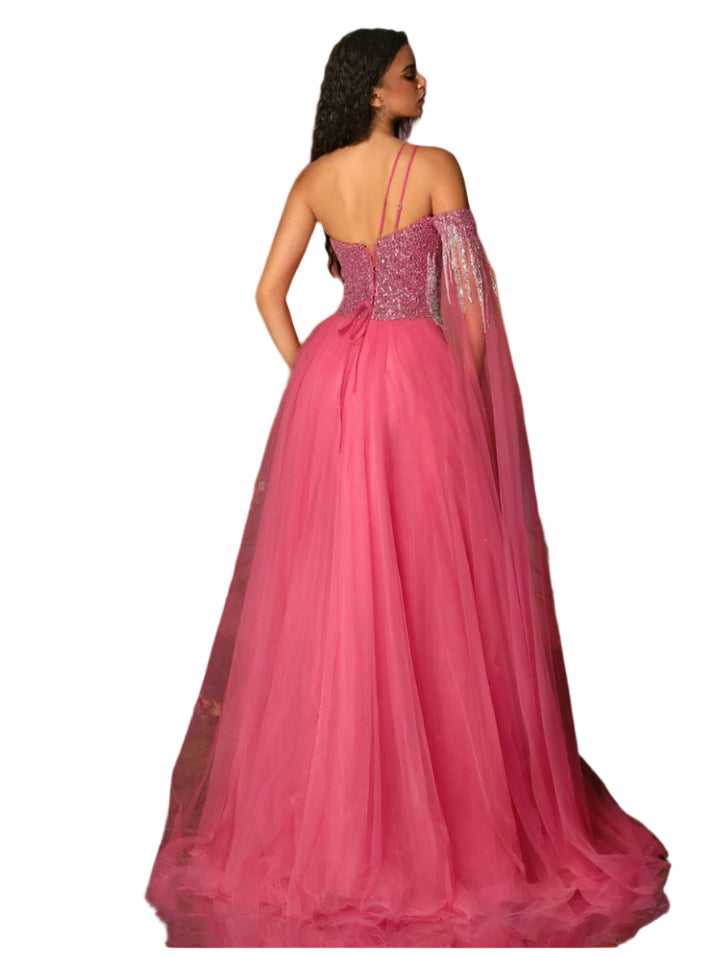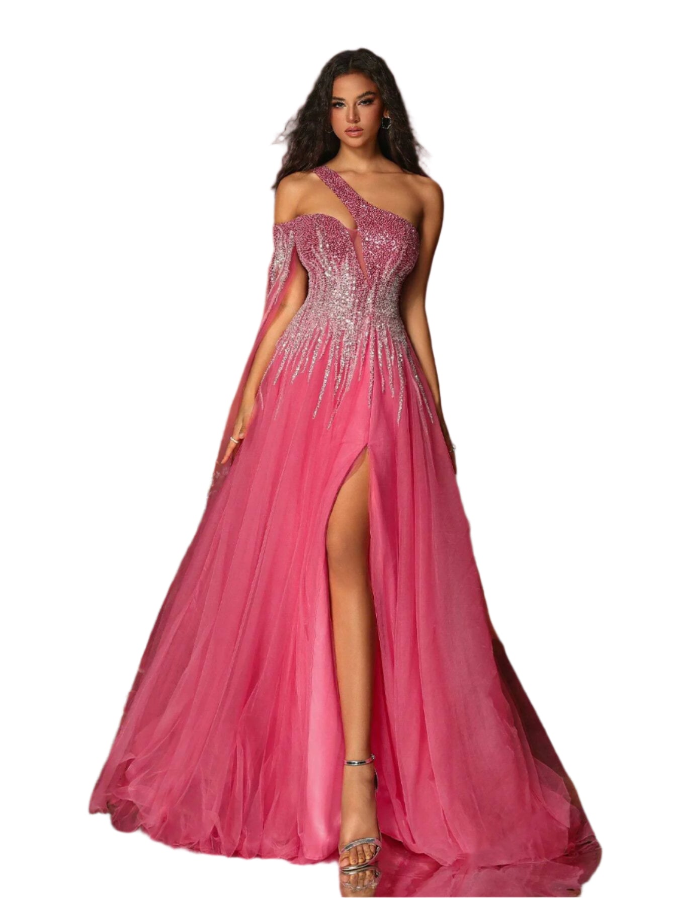 Címke nélküli, lenyűgöző pink estélyi ruha, egyedi aszimmetrikus vállmegoldással és csillogó díszítéssel. A felsőrészen lévő gyöngyhatású részletek és a lágyan leomló tüll szoknya garantáltan elegáns és különleges megjelenést biztosít. Ideális bálokra, gálákra vagy különleges eseményekre.