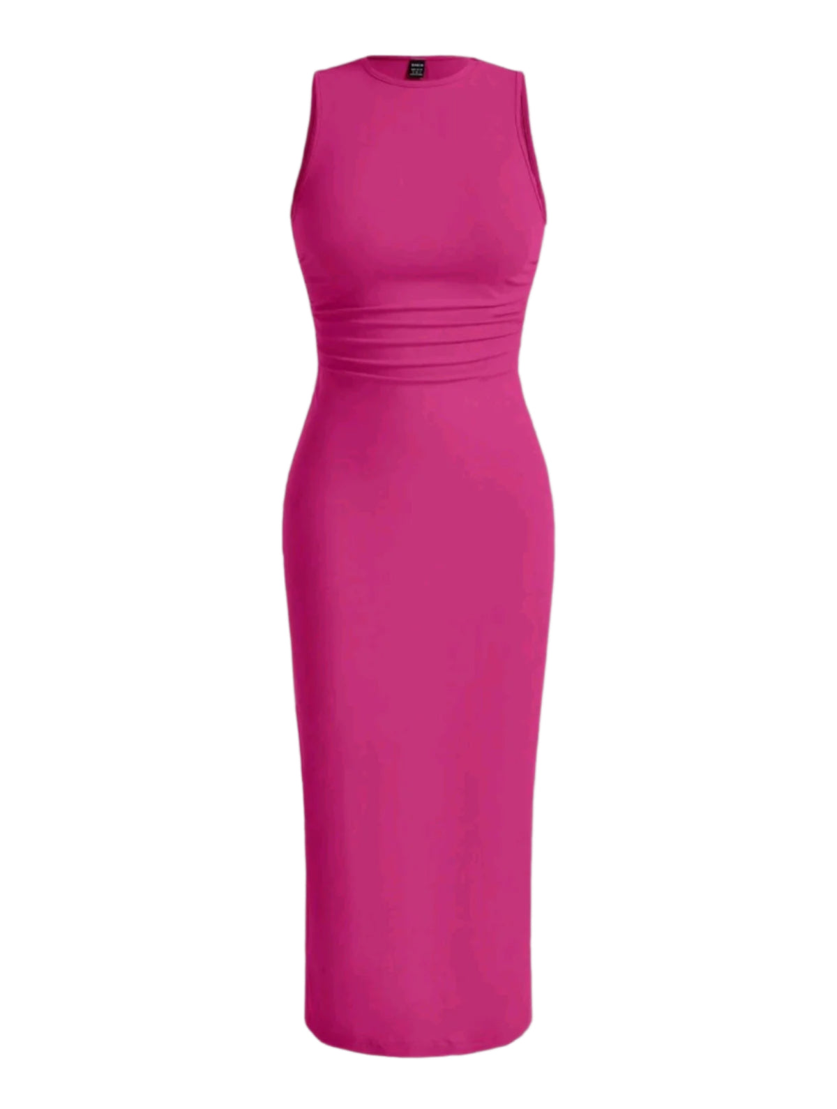 Címke nélküli, elegáns és nőies testhezálló midi ruha. Ujjatlan fazonja és kerek nyakkivágása letisztult megjelenést kölcsönöz. Derekán finoman redőzött részletek kiemelik az alakot, miközben a rugalmas anyag kényelmes viseletet biztosít. Tökéletes választás alkalmi eseményekre, munkahelyi viseletre vagy esti programokhoz.