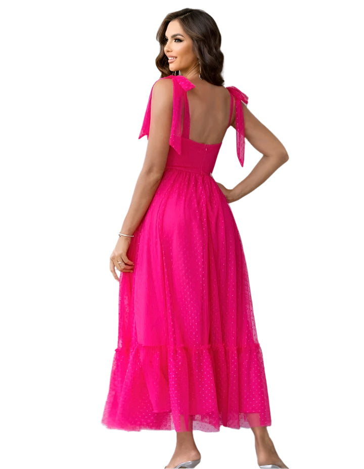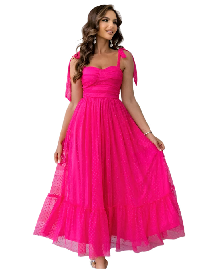 Címke nélküli, élénk pink maxi ruha könnyed tüll anyagból, romantikus pöttyös mintával. Állítható masnis pántokkal és szív alakú mellrésszel, amely kiemeli a nőies vonalakat. A bővülő, fodros szoknyarész légiesen elegáns megjelenést biztosít. Tökéletes választás alkalmi eseményekre, esküvőkre vagy különleges rendezvényekre.