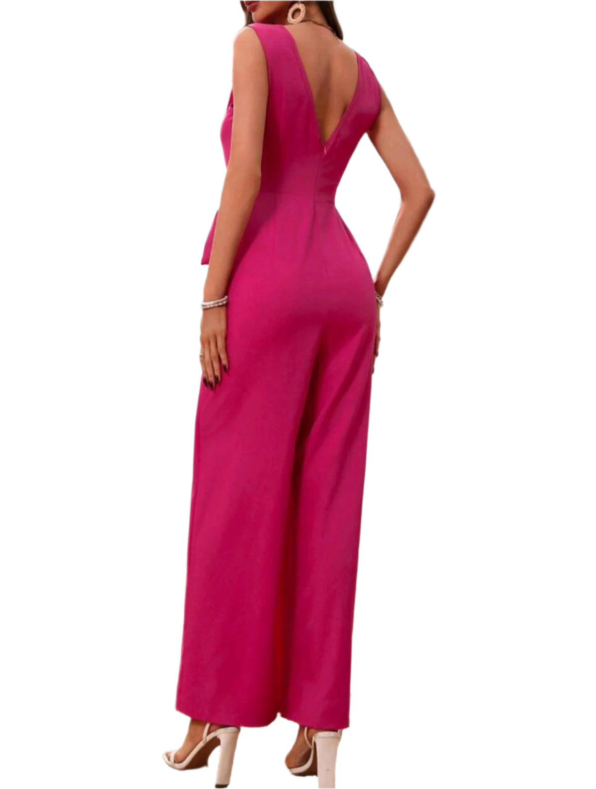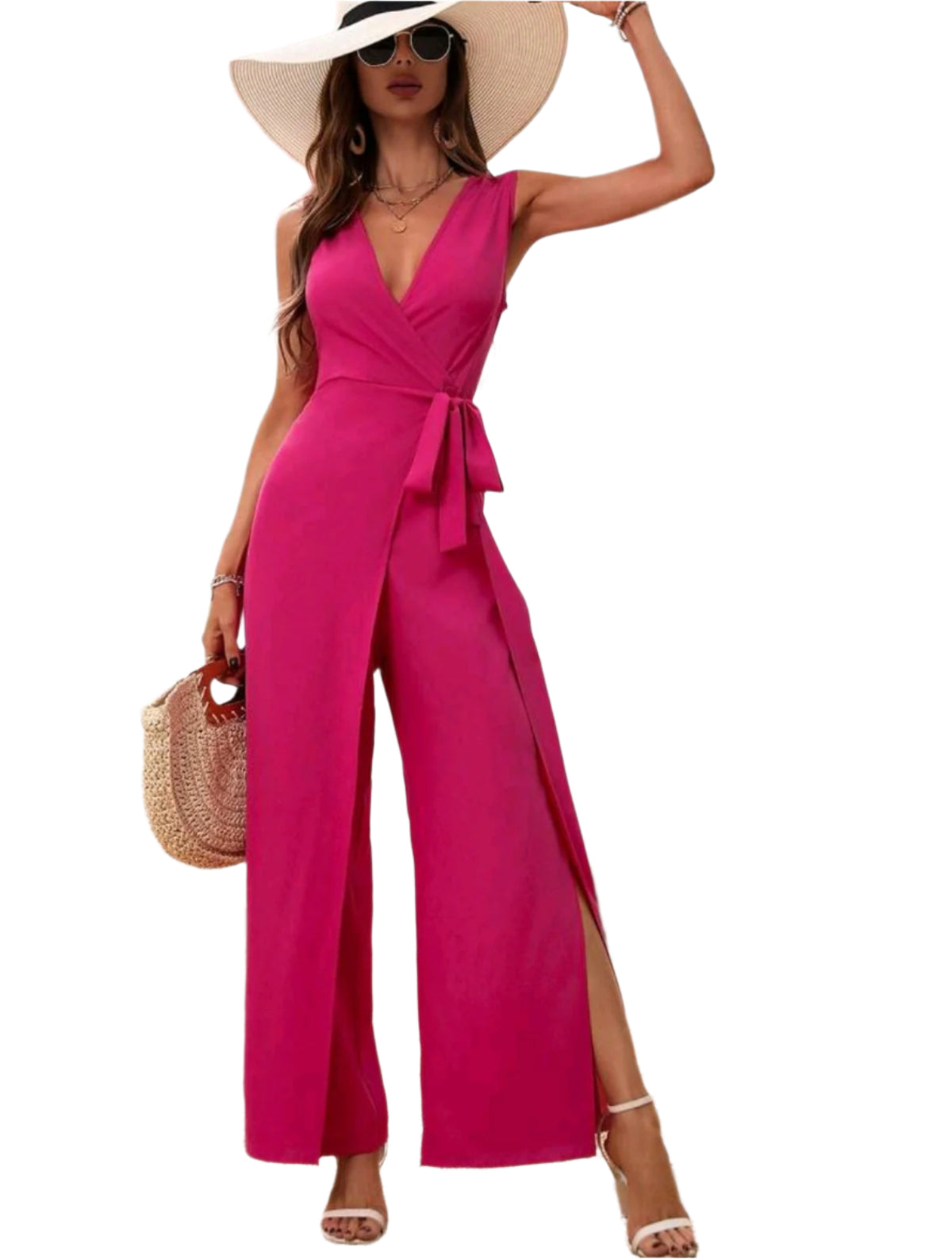 Címke nélküli, élénk pink overál mély V-kivágással és elegáns átkötős derékkal, amely kiemeli az alakot. Könnyed, légies anyaga kényelmes viseletet biztosít. Az oldalhasítékok modern és nőies megjelenést kölcsönöznek. Ideális nyári alkalmakra, elegáns vacsorákhoz vagy laza eleganciát igénylő eseményekre.
