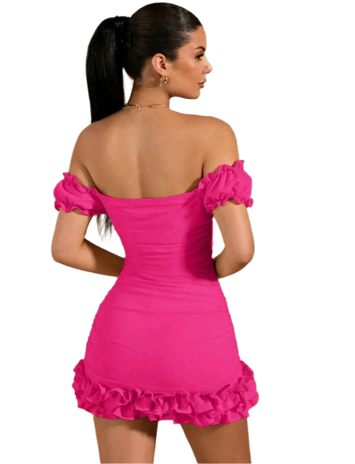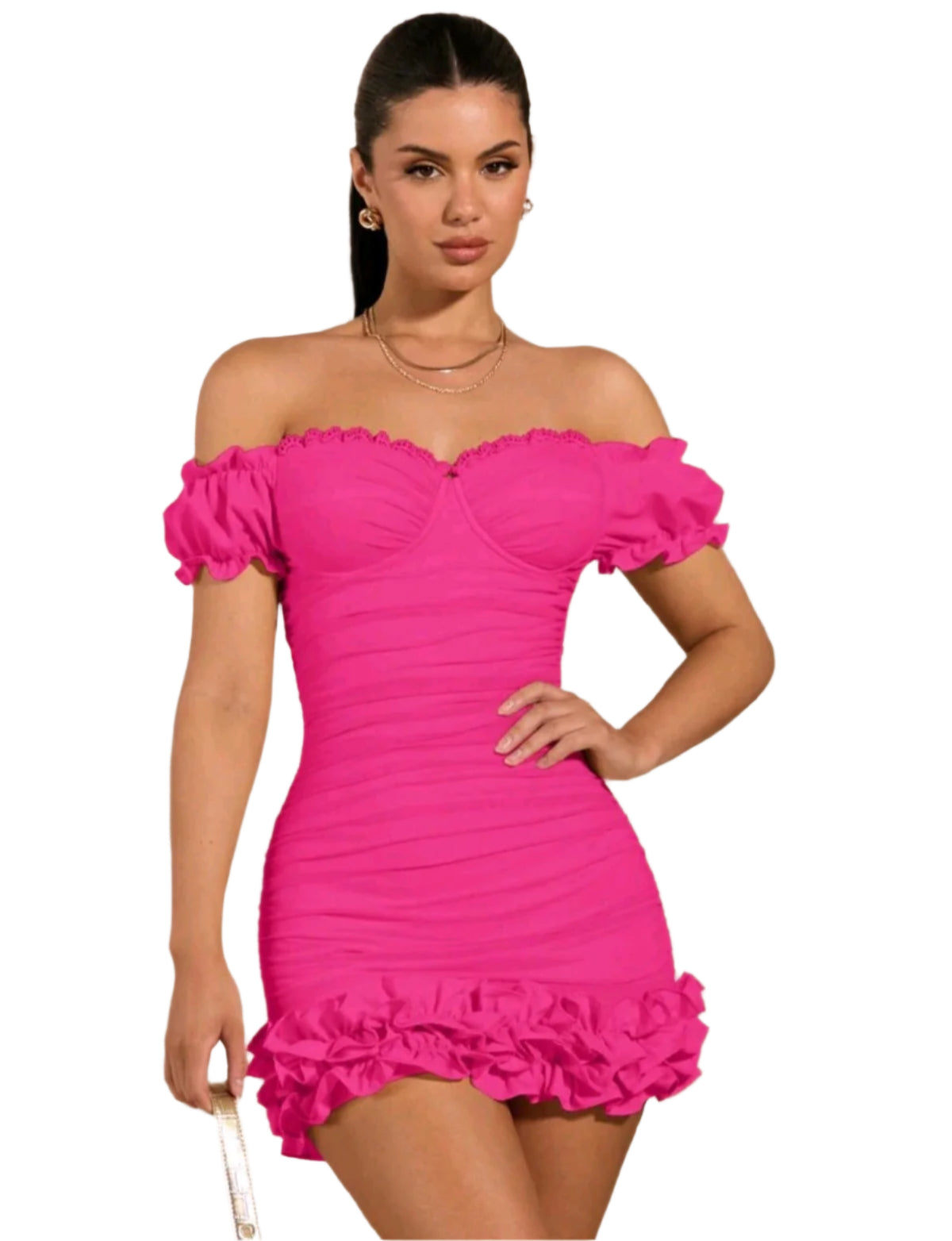 Címke nélküli, női ruha, nyári, élénk pink színben, váll nélküli kialakítással, fodros rövid ujjal és alsó szegéllyel, testhez simuló, ráncolt anyagból, mini fazon, nőies és szexi megjelenéshez, ideális partikra, esti programokra vagy különleges alkalmakra.
