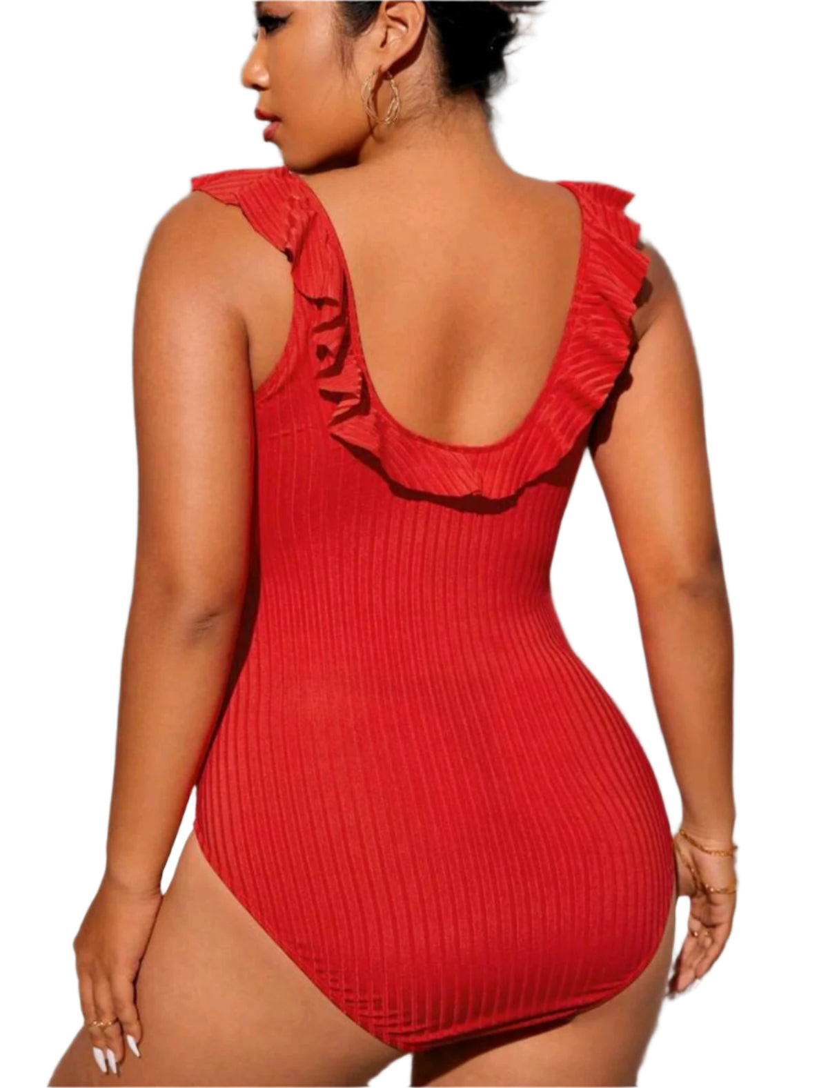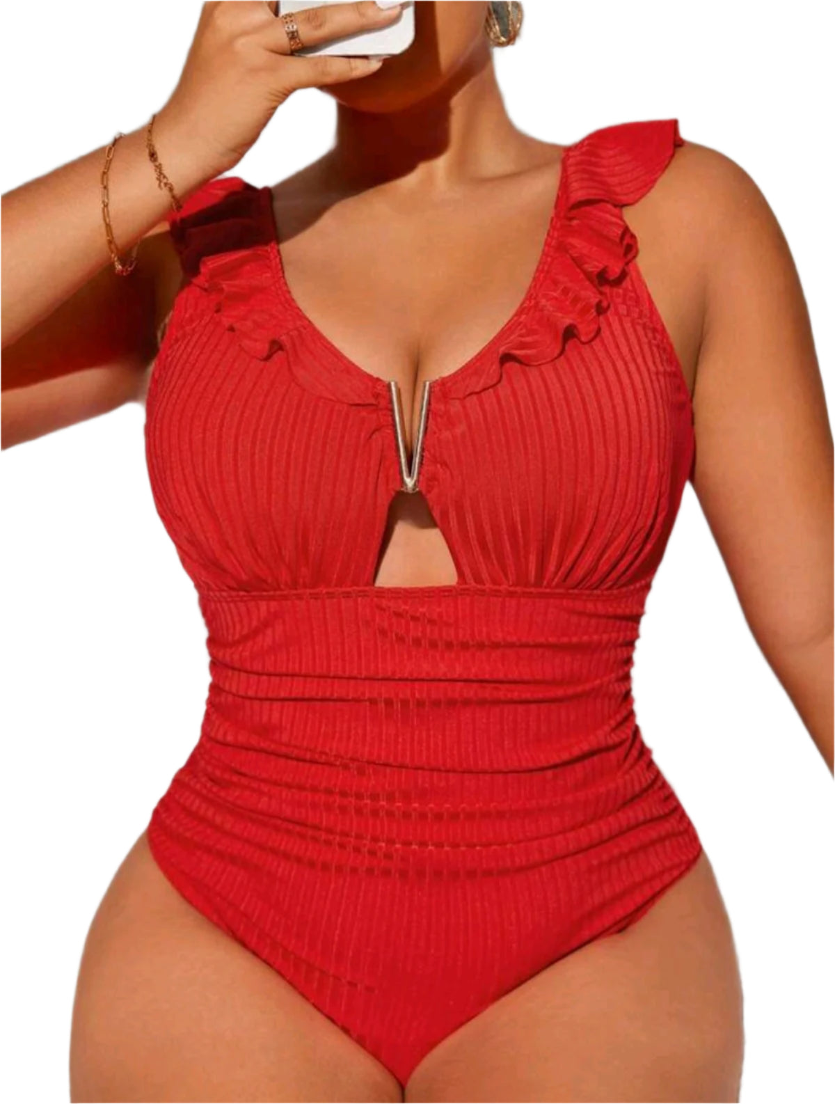 Címke nélküli, piros, bordázott rugalmas anyag, V-nyakkivágás fém díszítéssel, vállfodros kialakítás, alakformáló szabás, elegáns és nőies megjelenés.
