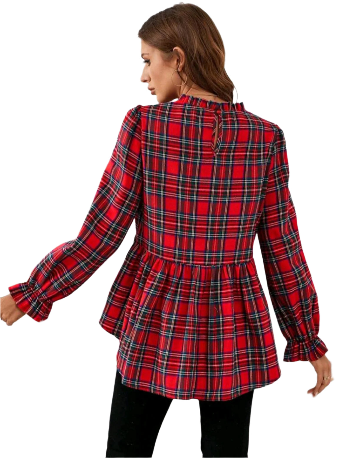 Címke nélküli, puha és kényelmes anyagból készült, piros-fekete kockás mintájú blúz. Magas nyakkivágással és fodros részletekkel a mandzsettán és a galléron. Laza, bő szabásának köszönhetően tökéletes hétköznapi viselethez, de akár ünnepi alkalmakra is stílusos választás lehet.