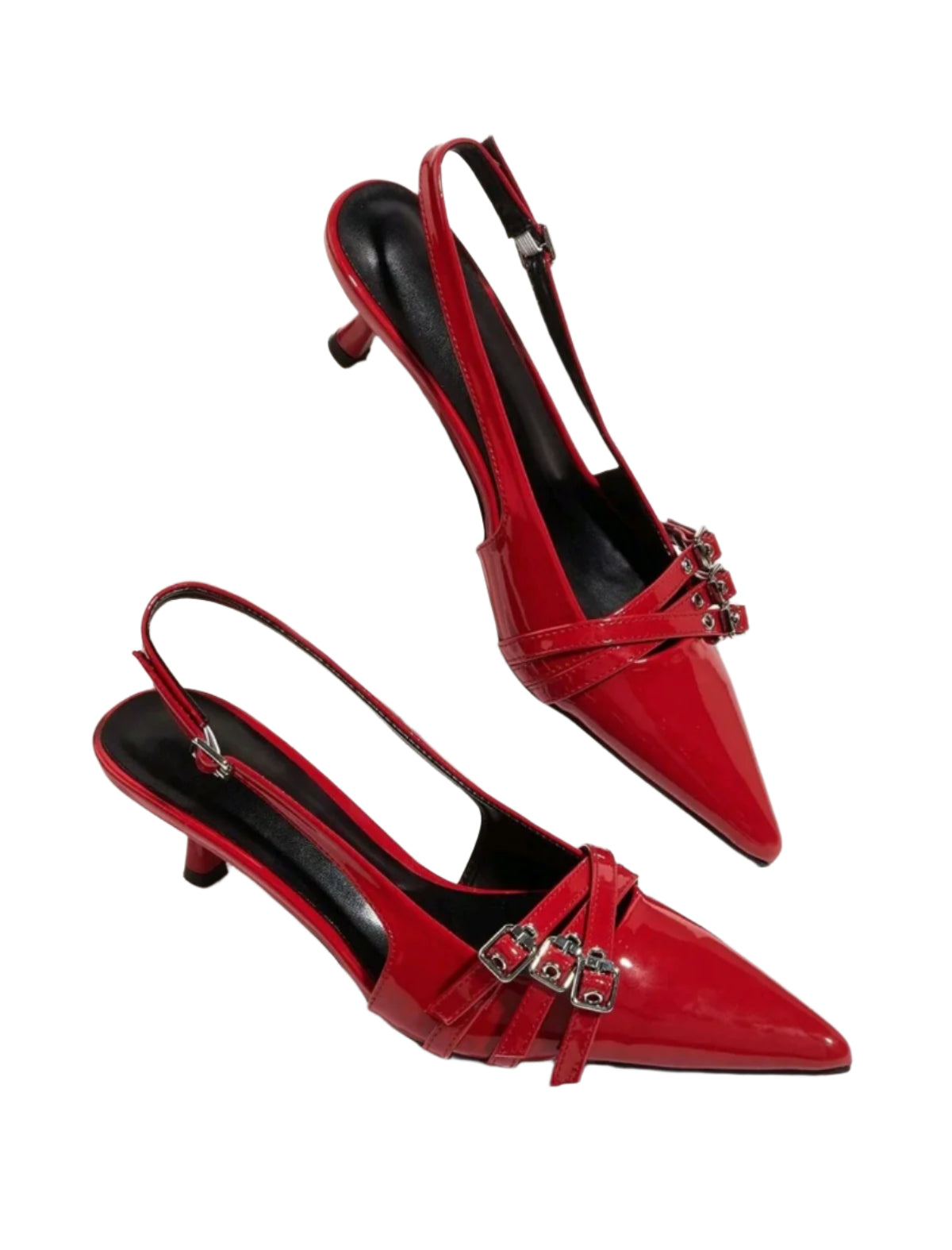 Címke nélküli, fényes piros lakbőr slingback cipő, hegyes orr-résszel és három dekoratív csattal az elülső pántokon. Alacsony, kecses sarokkal rendelkezik, elegáns és stílusos megjelenést biztosít különféle alkalmakra, például vacsorákra vagy irodai viselethez.