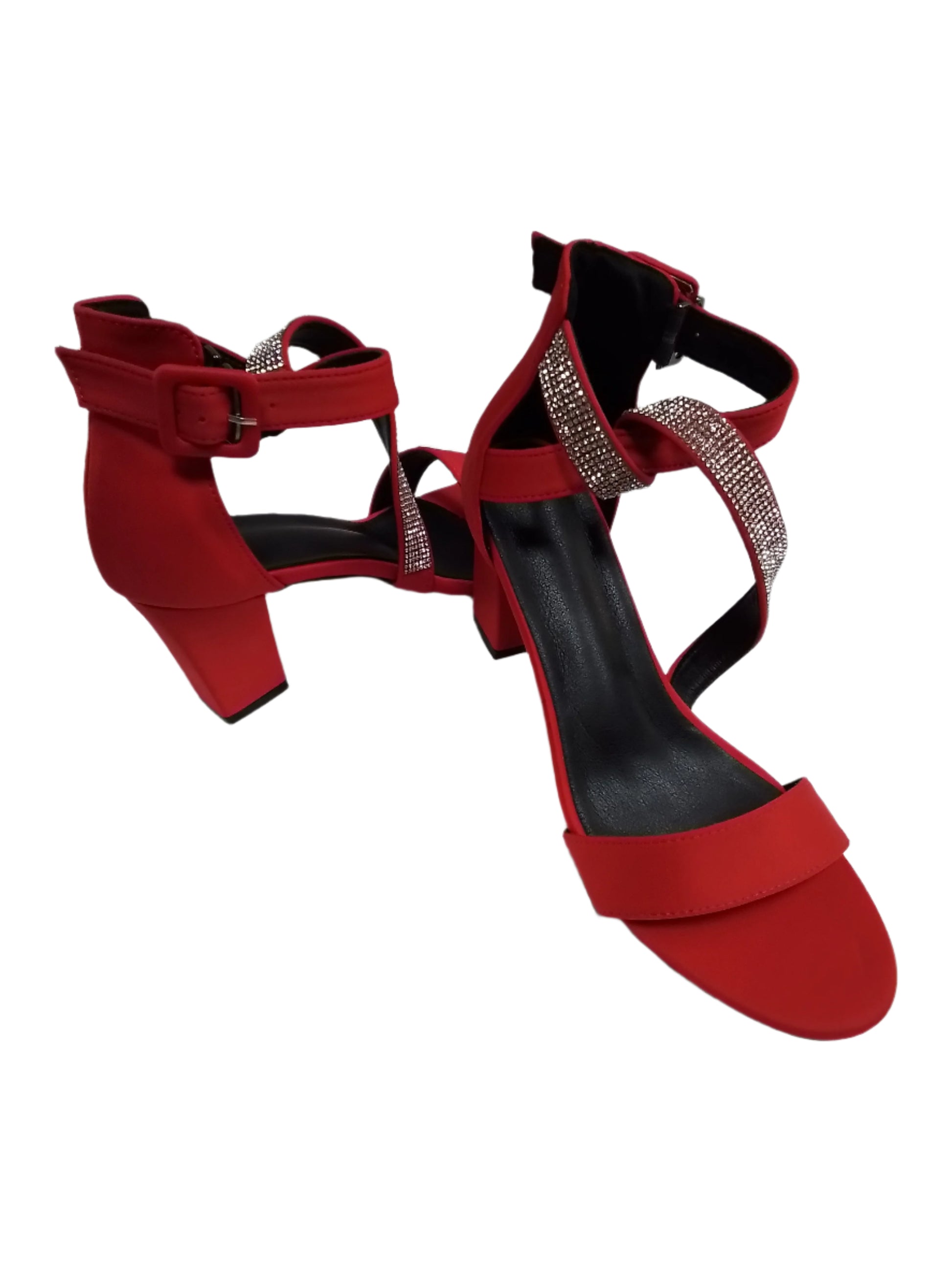 Címke nélküli, elegáns piros szandál csillogó strasszos bokapánttal és állítható csattal. Kényelmes, stabil középmagas sarokkal és fekete talpbéléssel. Kiváló választás alkalmi eseményekre, elegáns megjelenéshez.