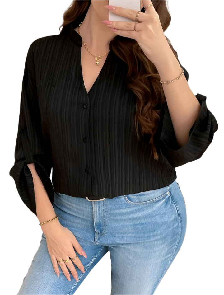 Címke nélküli, hosszú ujjú, gombos női ing. Könnyed pliszírozott anyaga elegáns esést biztosít, míg a finom V-nyakkivágás nőies megjelenést kölcsönöz. Az ujjak stílusos hasítékkal és gombos megoldással rendelkeznek. Klasszikus fekete árnyalat, amely bármilyen alkalomra tökéletes választás. Kombináld farmerrel a laza eleganciáért, vagy szoknyával egy kifinomult megjelenésért!