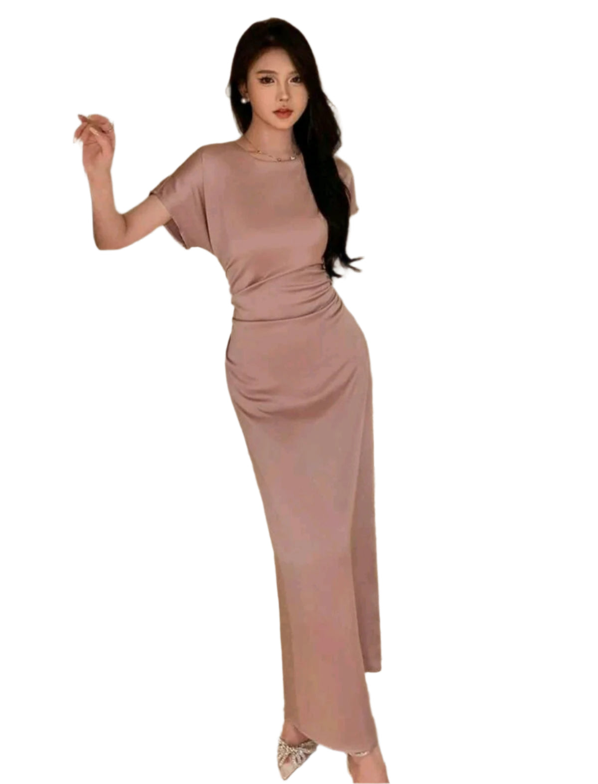 Címke nélküli, elegáns, szatén hatású anyagból készült hosszú ruha. Rövid ujjú, kerek nyakkivágással és lágy esésű szabással. Derékrésznél enyhén húzott, testhezálló fazon, amely kiemeli az alakot. Tökéletes választás alkalmakra, vacsorákra vagy esti programokra.