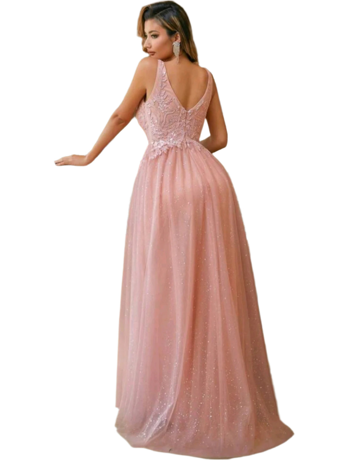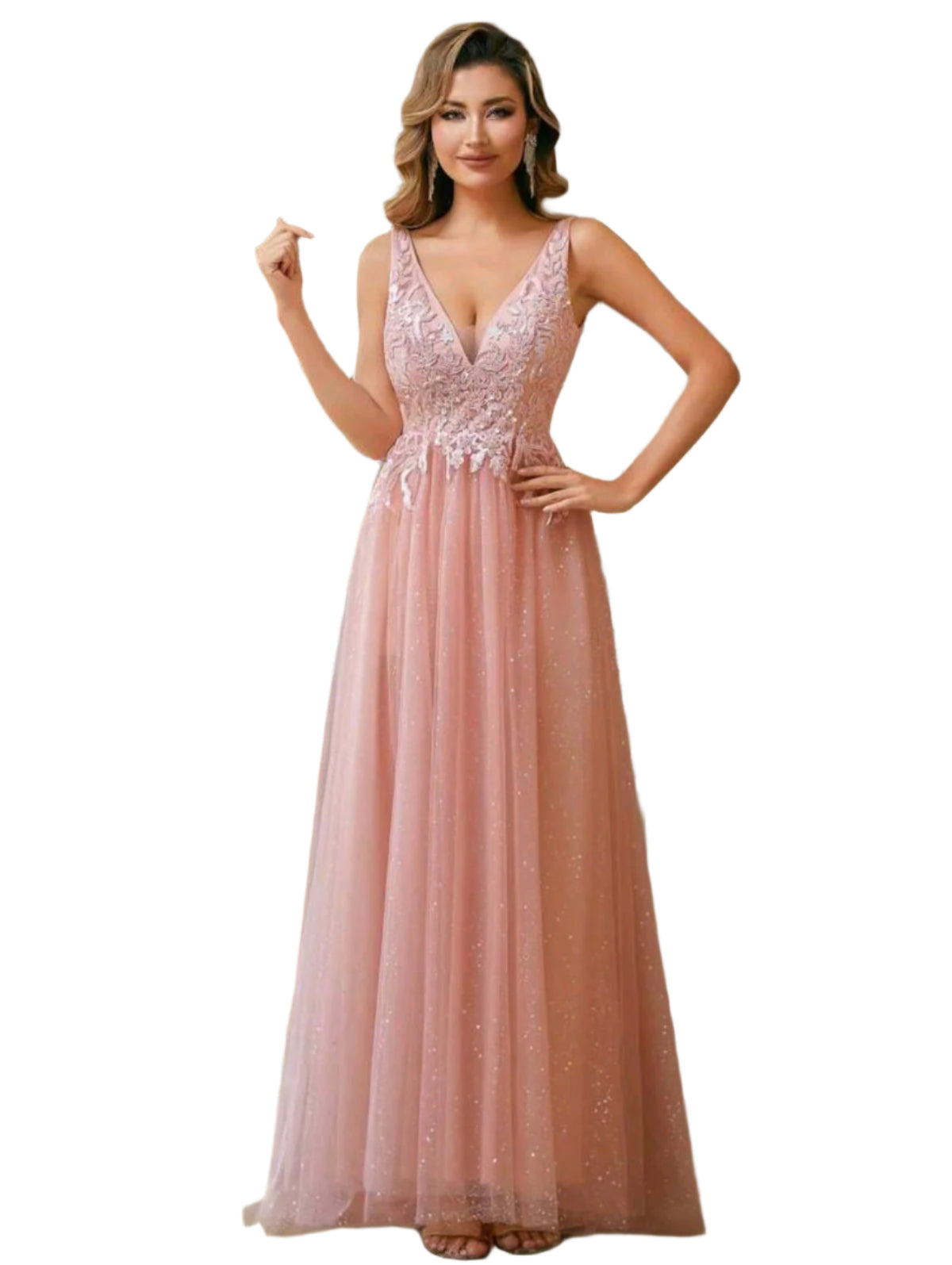 Címke nélküli, elegáns rózsaszín estélyi ruha, amely csipkével díszített felsőrésszel és finoman csillogó tüllszoknyával rendelkezik. Mély V-kivágása és karcsúsított szabása kiemeli az alakot, míg a hosszú, lágyan leomló szoknya romantikus megjelenést kölcsönöz. Tökéletes választás esküvőkre, bálokra vagy elegáns eseményekre.