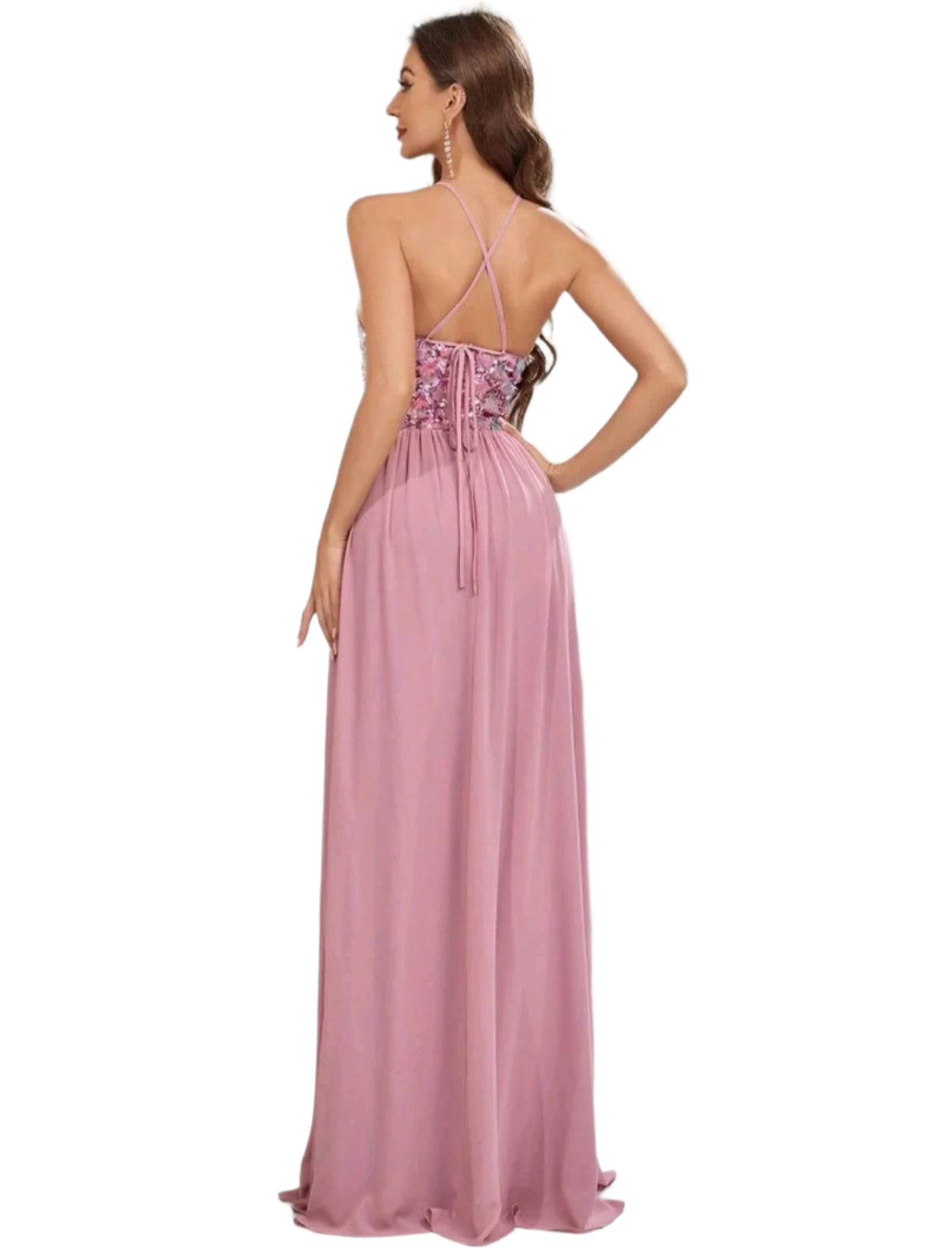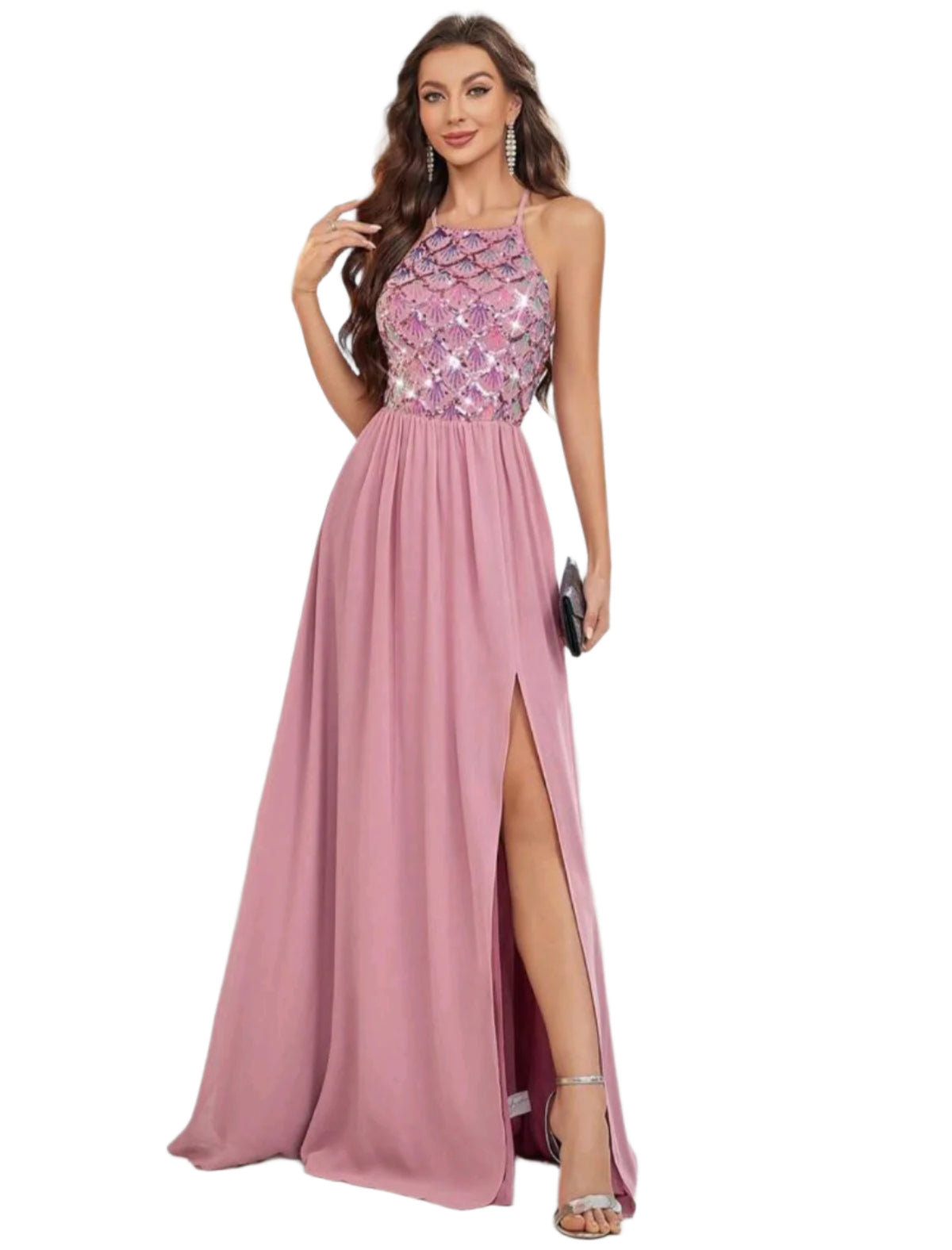 Címke nélküli, gyönyörű rózsaszín maxi ruha, amely tökéletes választás estélyekre, esküvőkre vagy különleges alkalmakra. A ruha felsőrésze csillogó flitterekkel díszített, elegáns hálós kialakítású, amely különleges fényt kölcsönöz. A karcsúsított derékrész kiemeli az alakot, míg a hosszú, lágy esésű szoknya nőies és kifinomult megjelenést biztosít. A combközépig érő felsliccelés elegánsan kihangsúlyozza a lábat.