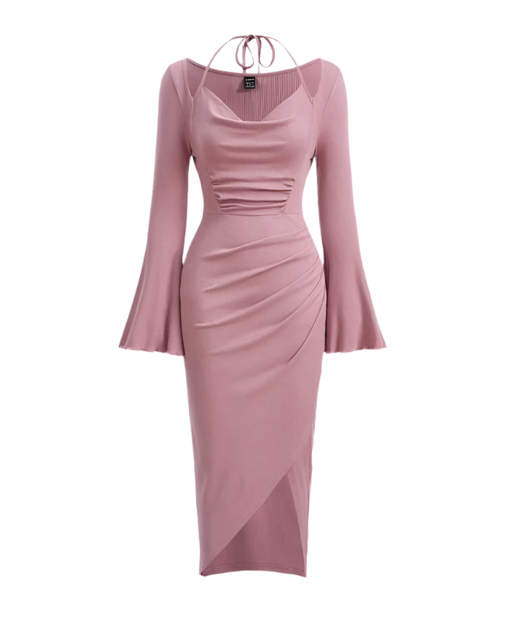 Címke nélküli, rózsaszín, testhezálló midi ruha különleges nyakba kötős kialakítással. Hosszú harangujjai és aszimmetrikus szoknyarésze elegáns és kifinomult megjelenést biztosít. Mellrészén finoman ráncolt dizájnja nőies vonalakat emel ki, míg a rugalmas anyag kényelmes viseletet garantál. Ideális választás alkalmi eseményekre, esti programokra vagy elegáns megjelenéshez.