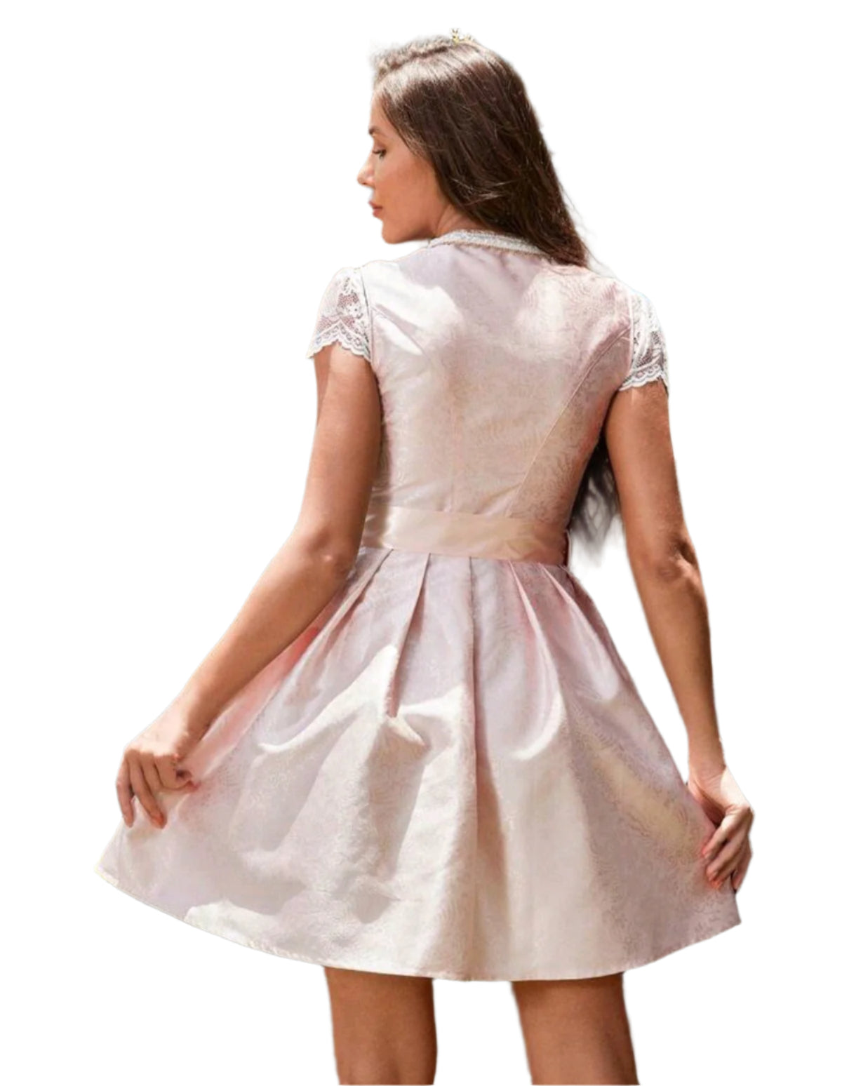 Címke nélküli, romantikus stílusú rövid dirndl ruha, elegáns hímzett csipke réteggel és szatén fűzővel díszítve. Rövid, csipkés ujja és mély, szív alakú nyakkivágása nőies megjelenést kölcsönöz. Tökéletes választás fesztiválokra, népi rendezvényekre vagy különleges alkalmakra.