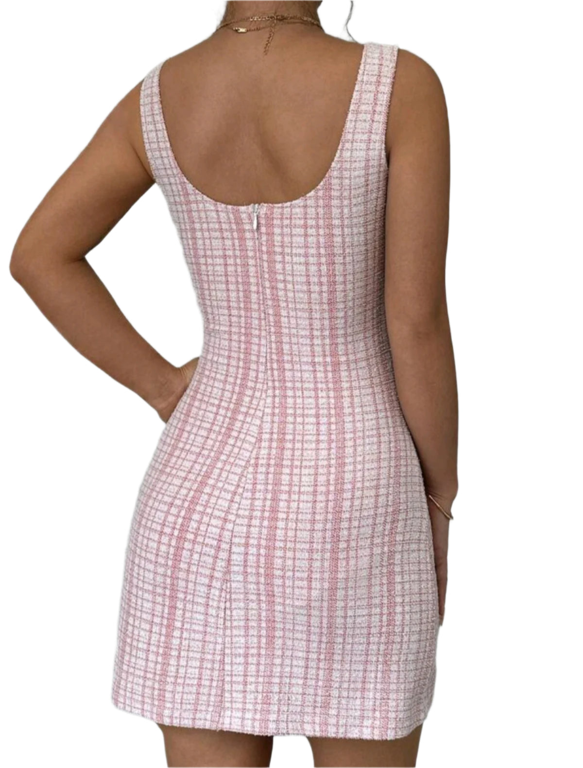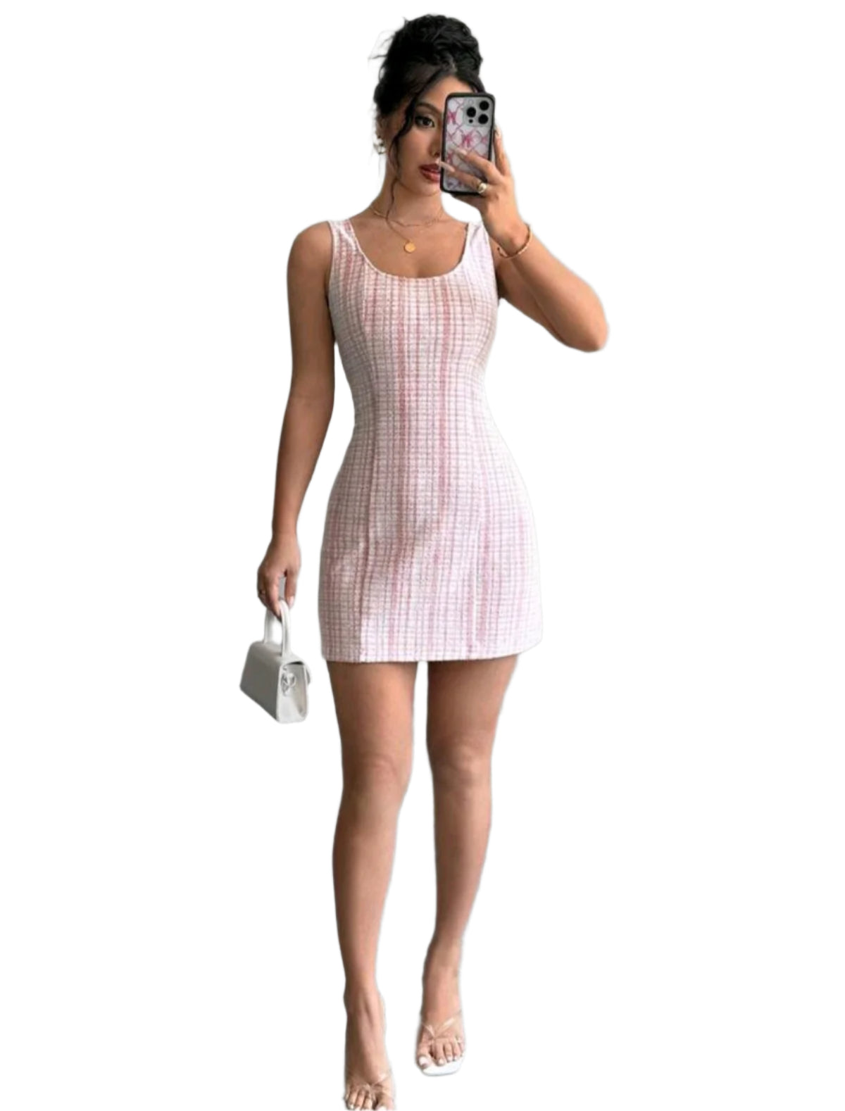 Címke nélküli, rózsaszín-fehér kockás mintás mini ruha. Testhezálló szabású, rugalmas anyagból készült, amely kiemeli az alakot. Ujjatlan, kerek nyakkivágású kialakítása modern és elegáns megjelenést biztosít. Ideális választás hétköznapi viseletre vagy elegánsabb alkalmakra egyaránt.