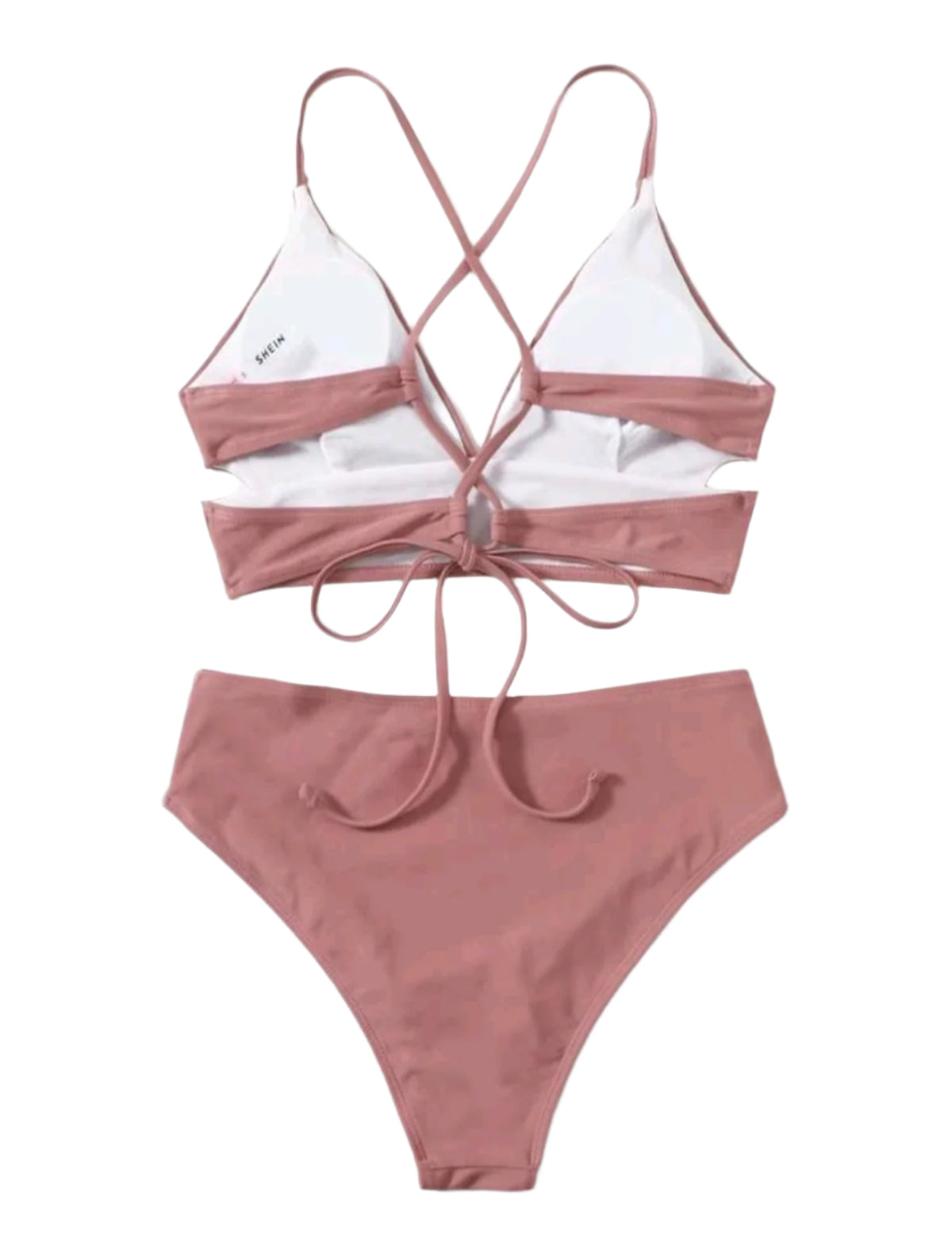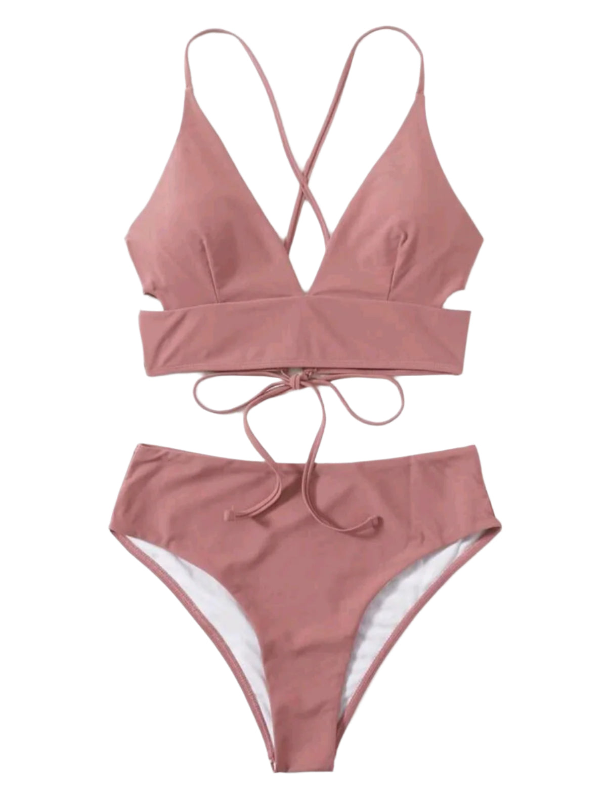 Címke nélküli, rózsaszín, sima anyag, háromszög fazonú felsőrész keresztezett hátmegoldással és elöl megkötővel, magas derekú alsó.