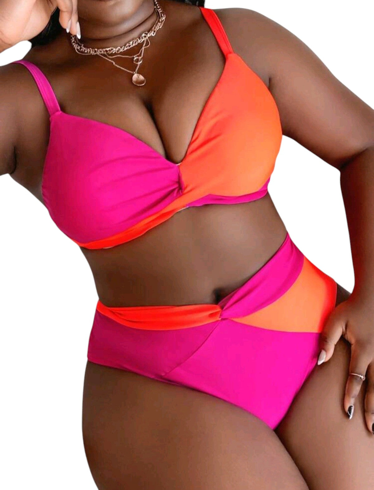 Címke nélküli, rózsaszín, narancssárga, színblokkos, kétrészes, V-nyakkivágás, széles pánt, magasított derékrész, csavart részlet elöl.