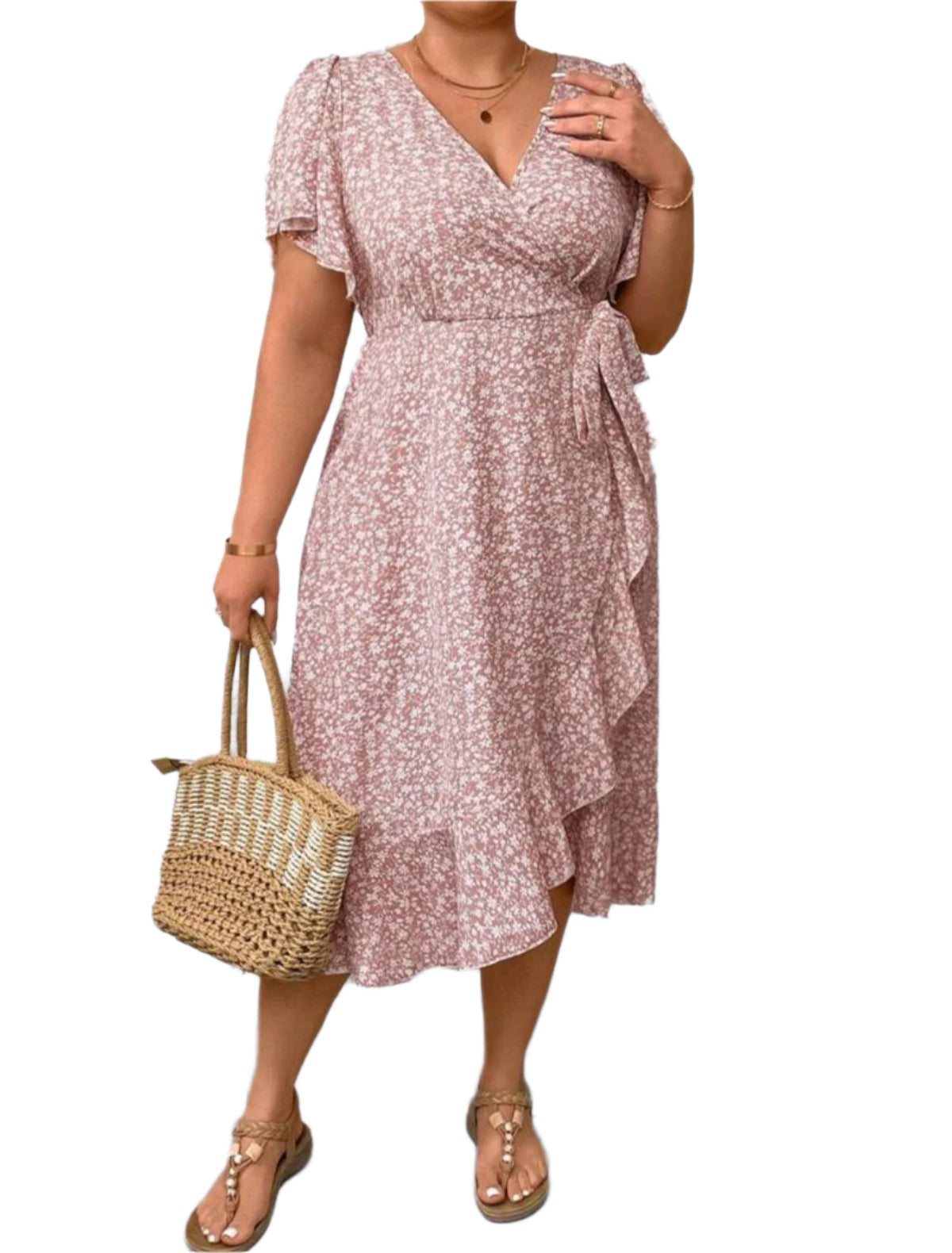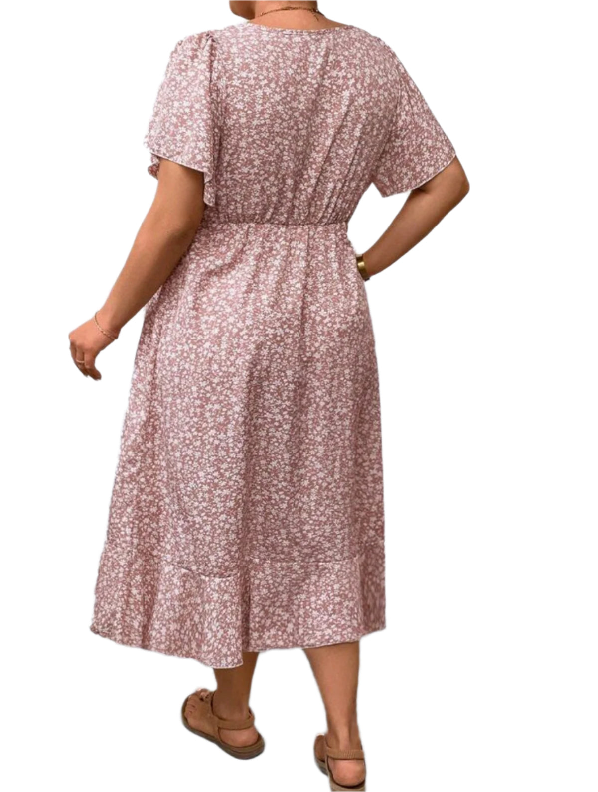 Címke nélküli, női midi ruha, romantikus rózsaszín alapon apró virágmintával díszítve. Átlapolt V-nyakkivágással és rövid, fodros ujjakkal, melyek nőies hatást kölcsönöznek. Derékban megkötős kialakítás, amely kiemeli az alakot, aszimmetrikus fodros szegéllyel. Kényelmes és elegáns választás tavaszi-nyári alkalmakra.