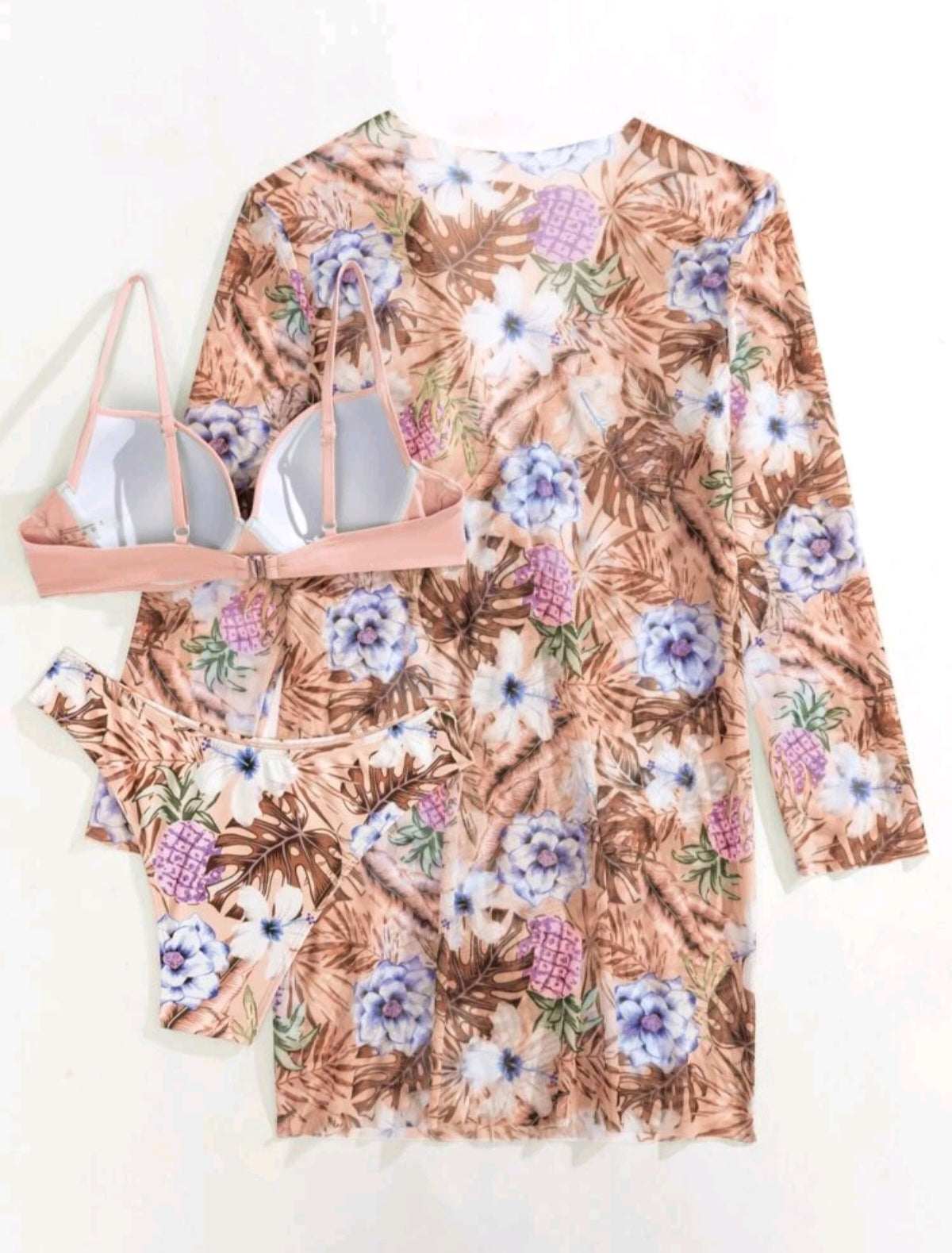 Címke nélküli, elegáns rózsaszín háromrészes bikini szett. A finoman fodrozott, merevített melltartó kényelmes tartást biztosít, míg a magasderekú alsó és a hozzá illő, könnyű anyagú virágmintás strandkendő stílusos megjelenést kölcsönöz. Ideális választás tengerpartra, medence mellé vagy nyaraláshoz.