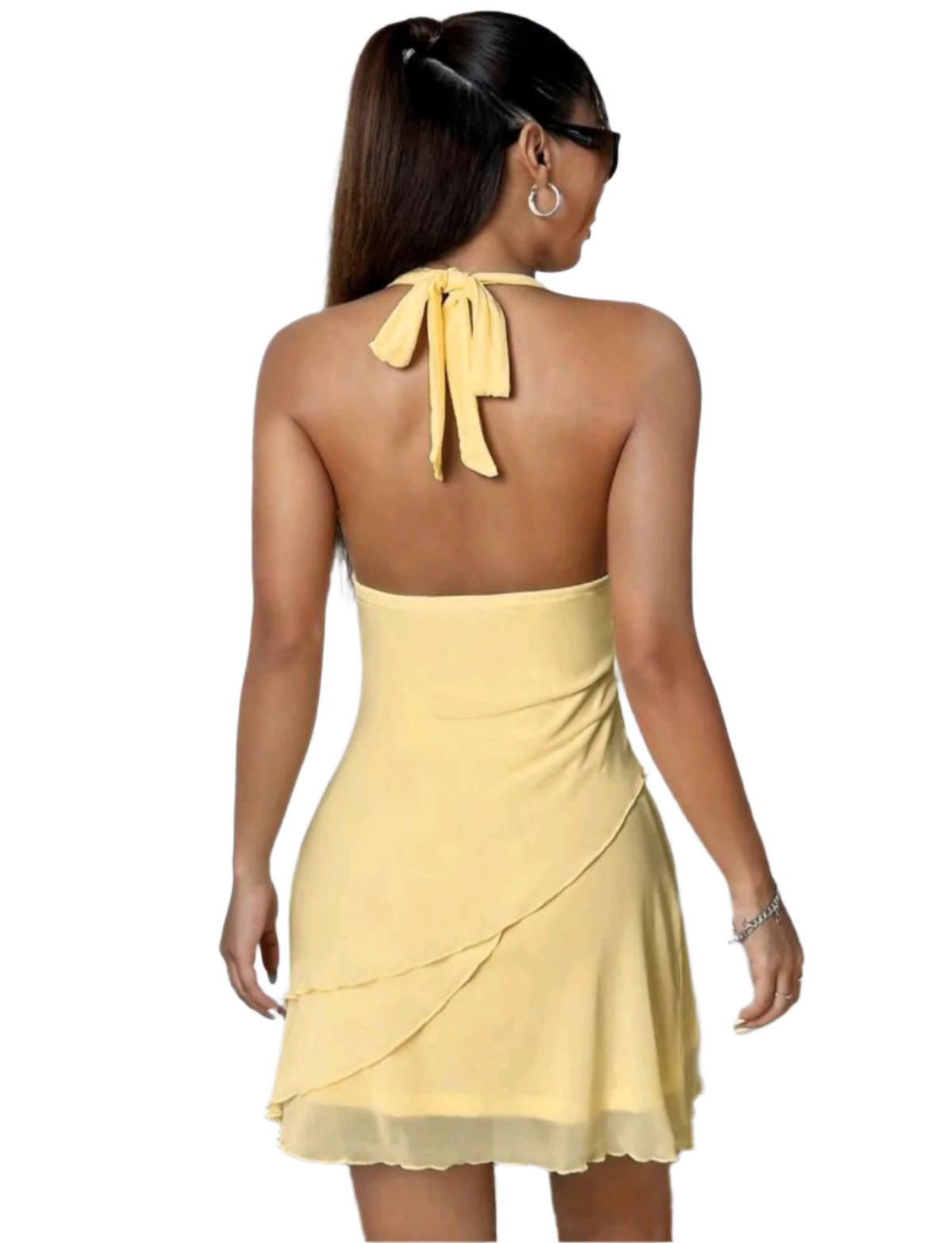 Címke nélküli, könnyed esésű, testhez simuló mini ruha. Mély dekoltázzsal, nyakba akasztós pántmegoldással és enyhén fodros alsó szegéllyel. Légies anyaga és halvány sárga színe ideálissá teszi nyári bulikra, randikra vagy nyaraláshoz.