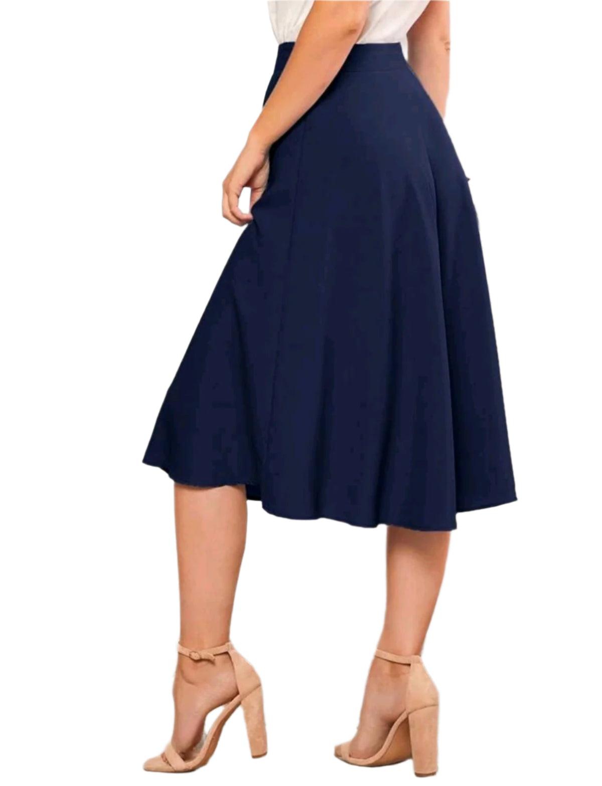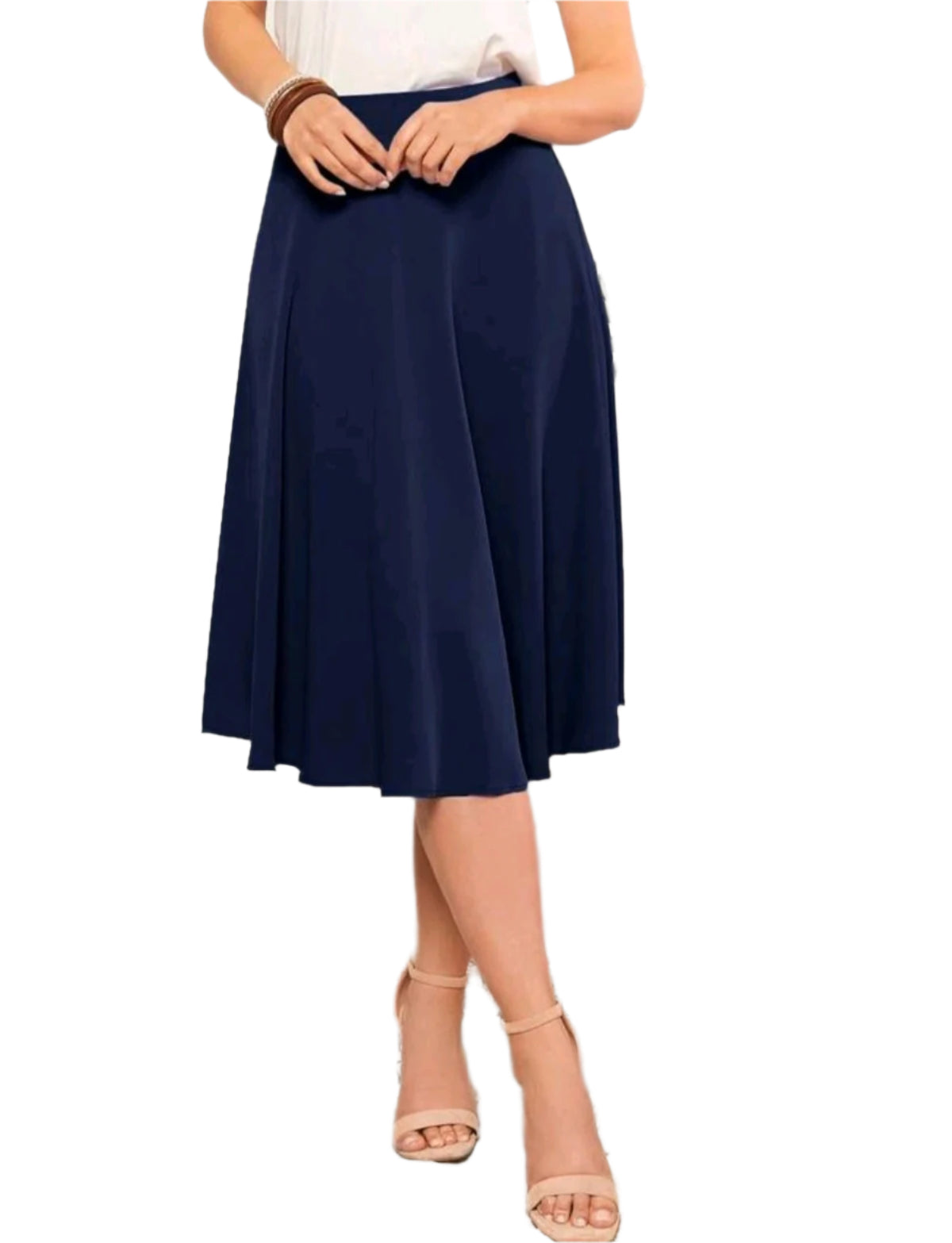 Címke nélküli, sötétkék színű, A-vonalú szoknya. Közepesen hosszú fazonja elegáns és kényelmes viseletet biztosít. Légies, könnyed anyaga tökéletes választás hétköznapi és alkalmi viselethez egyaránt.