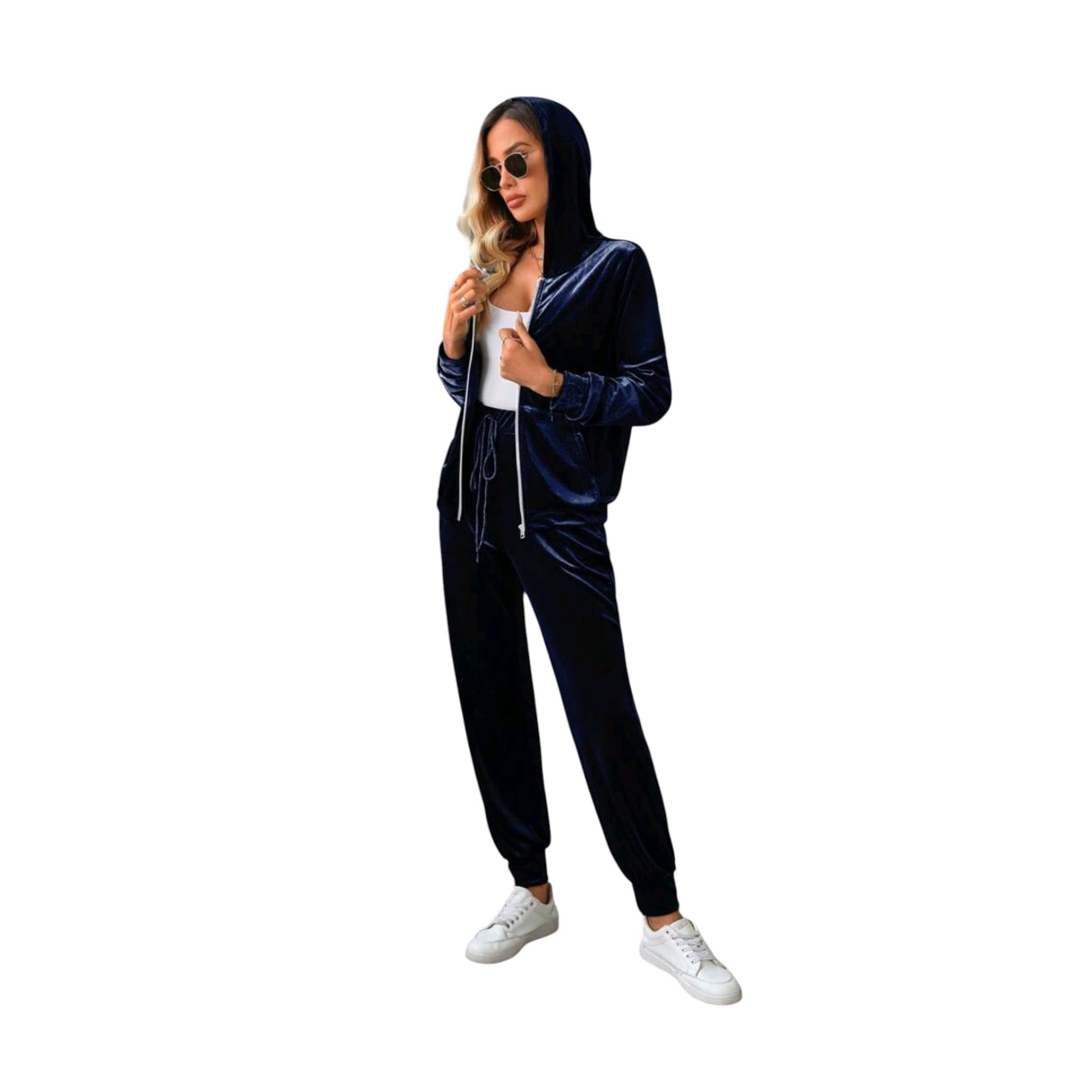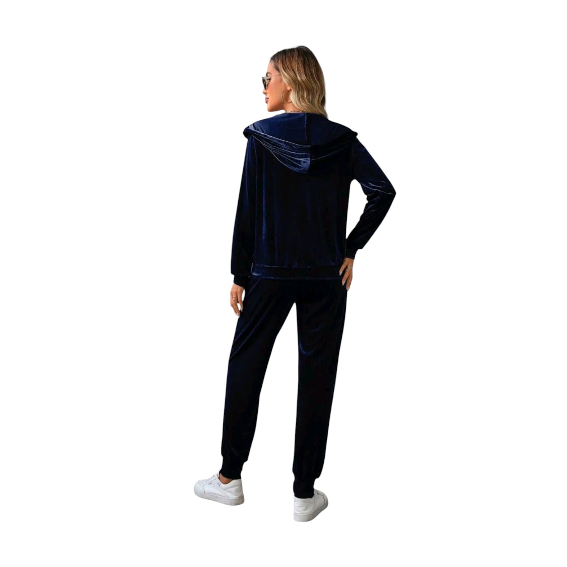 Címke nélküli, sötétkék, bársony melegítő szett, kapucnis felsővel és melegítőnadrággal.