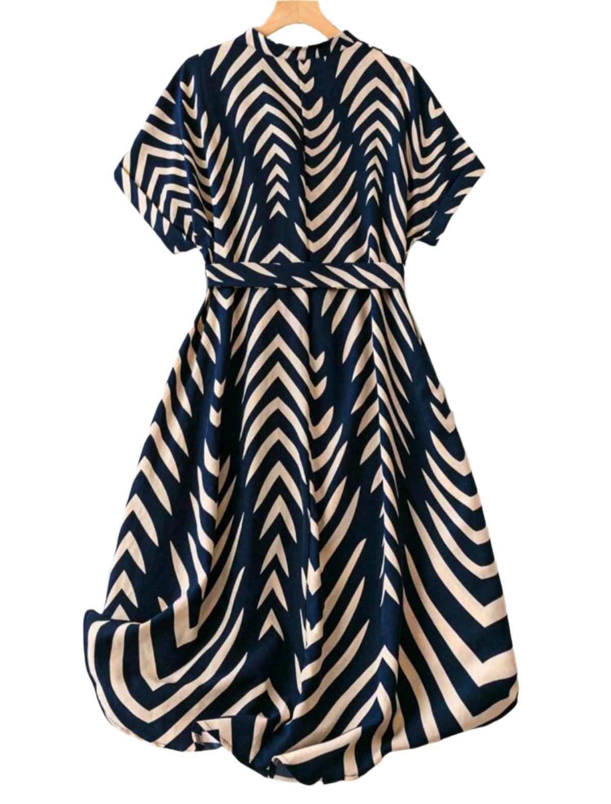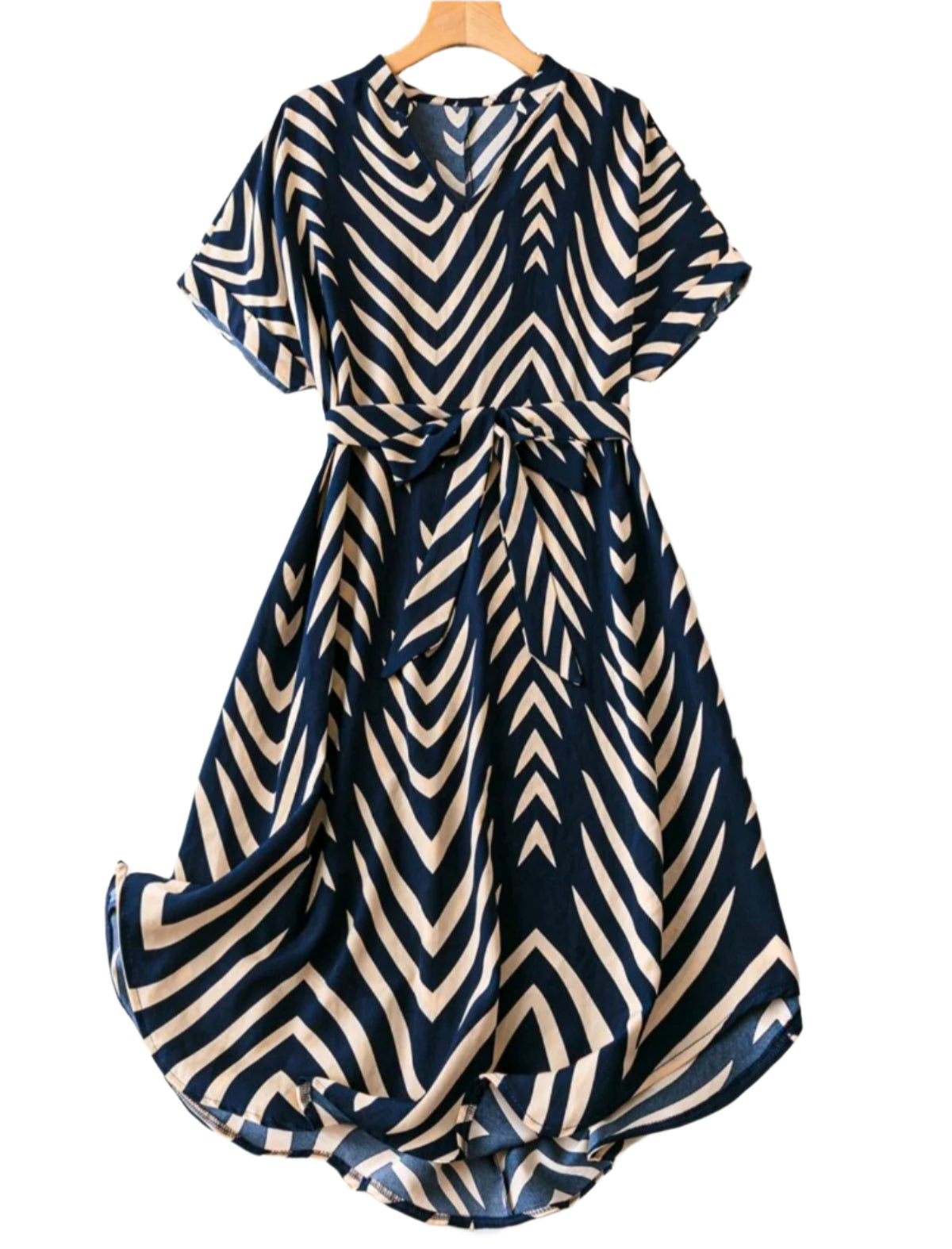 SHE sötétkék bézs mintás derékmegkötős midi ruha