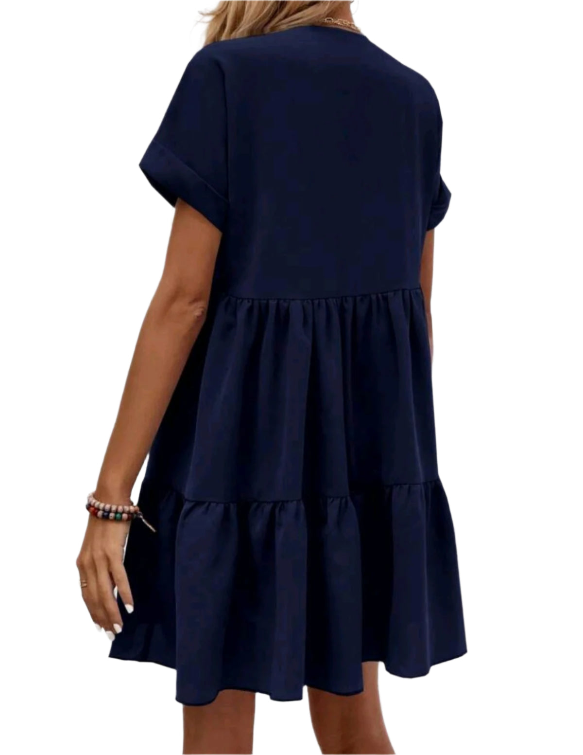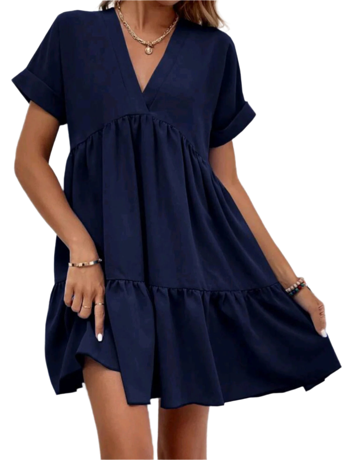 Címke nélküli, női ruha, nyári, sötétkék színű, V-kivágással, rövid hajtott ujjakkal, laza és bő szabásban, kétszintes fodros kialakítással, könnyed, légáteresztő anyagból, kényelmes viselet hétköznapokra, nyaraláshoz vagy városi sétákhoz.