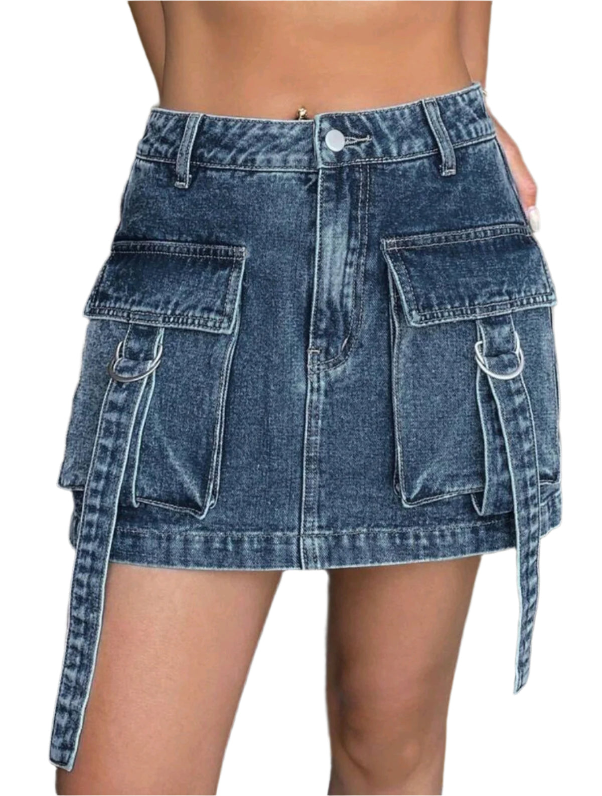 Címke nélküli, sötétkék színű farmer szoknya, divatos cargo stílusú nagy zsebekkel és dekoratív pántokkal. Magas derekú fazon, amely kiemeli az alakot. Kényelmes és trendi viselet mindennapi outfitekhez vagy vagány megjelenéshez.