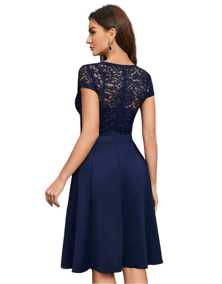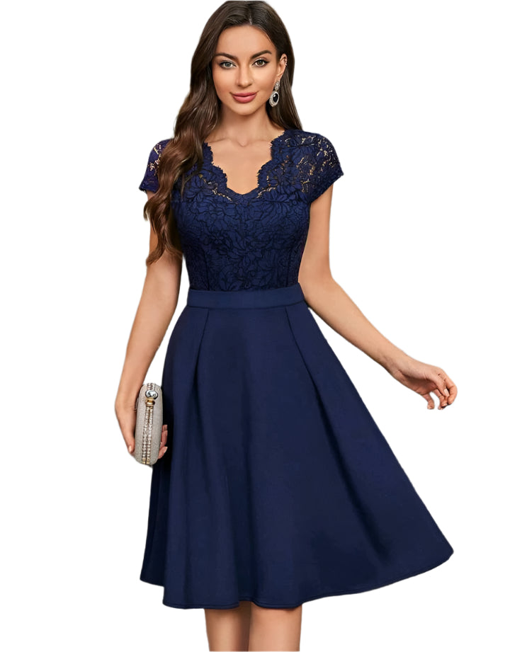 Címke nélküli, elegáns sötétkék midi ruha finom csipkebetéttel a felső részen és rövid ujjakkal. A derékvonal kiemeli az alakot, az A-vonalú szoknya pedig romantikus, nőies megjelenést biztosít. Ideális alkalmi és elegáns eseményekre.