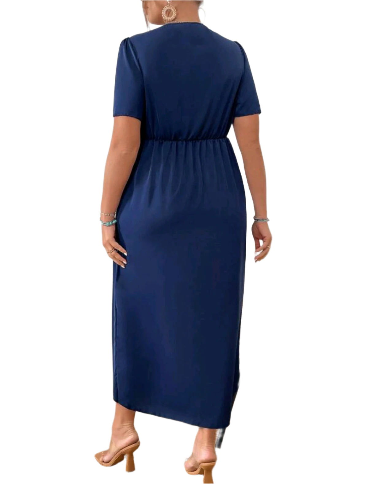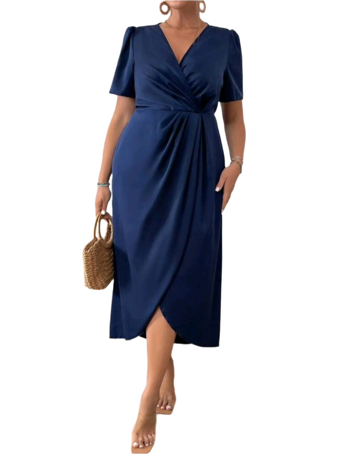 Címke nélküli, sötétkék midi ruha elegáns V-nyakkivágással és keresztbe tett elülső redőzéssel. Rövid ujjas kialakítás, derékhangsúlyos szabás és aszimmetrikus szoknyarész teszi különlegessé. Ideális választás alkalmi eseményekre, munkahelyre vagy elegáns megjelenéshez.