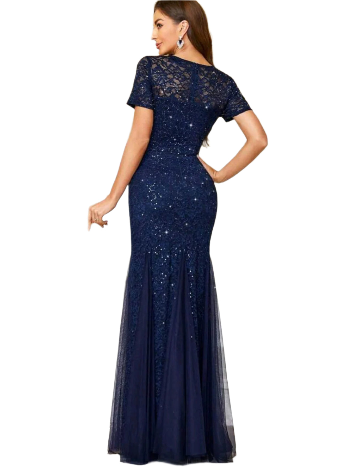 Címke nélküli, sötétkék flitteres estélyi ruha. Rövid ujjú, csipkés felsőrésszel és kerek nyakkivágással, amely eleganciát sugároz. Testhezálló szabás, flitteres díszítés és alsó részén tüllbetétek teszik különlegessé. Tökéletes választás esküvőkre, bálokra és elegáns eseményekre.